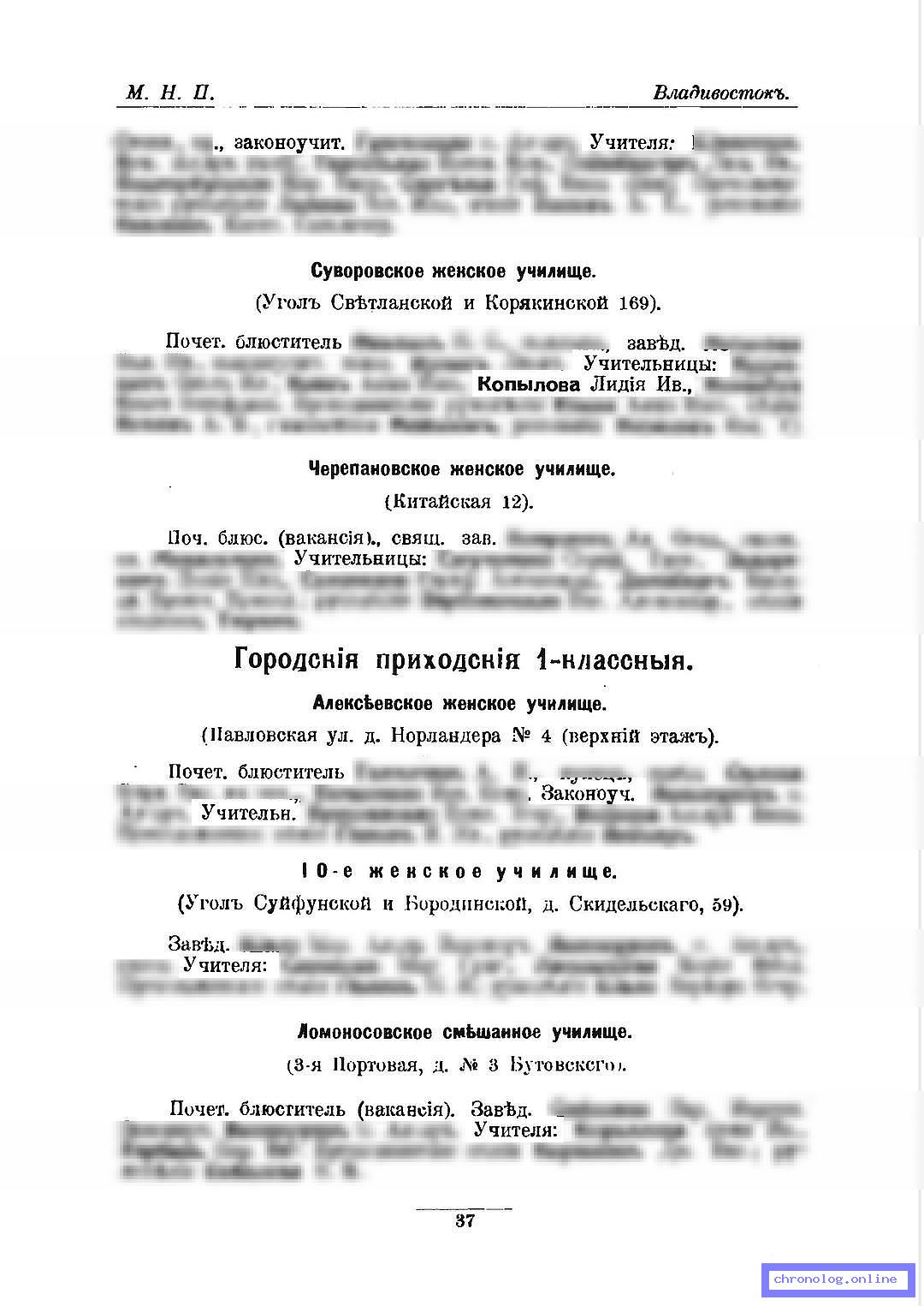 Разное СИ-ПО-1916, стр.37 (Памятная книжка Приморской области на 1916 год): Учительница Суворовского женского училища Лидия Ивановна Копылова. Время и место исхода не показано. Снимки: 37. | |||