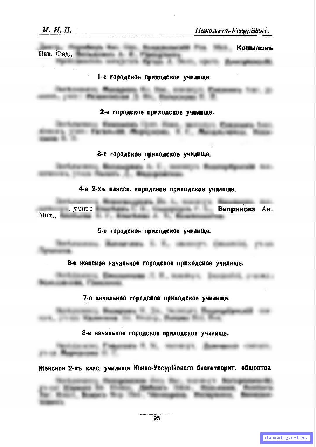 Разное СИ-ПО-1916, стр.95 (Памятная книжка Приморской области на 1916 год): Учительница 4-го двухклассного городского приходского училища Анастасия Михайловна Веприкова. Время и место исхода не показано. Снимки: 95. | |||