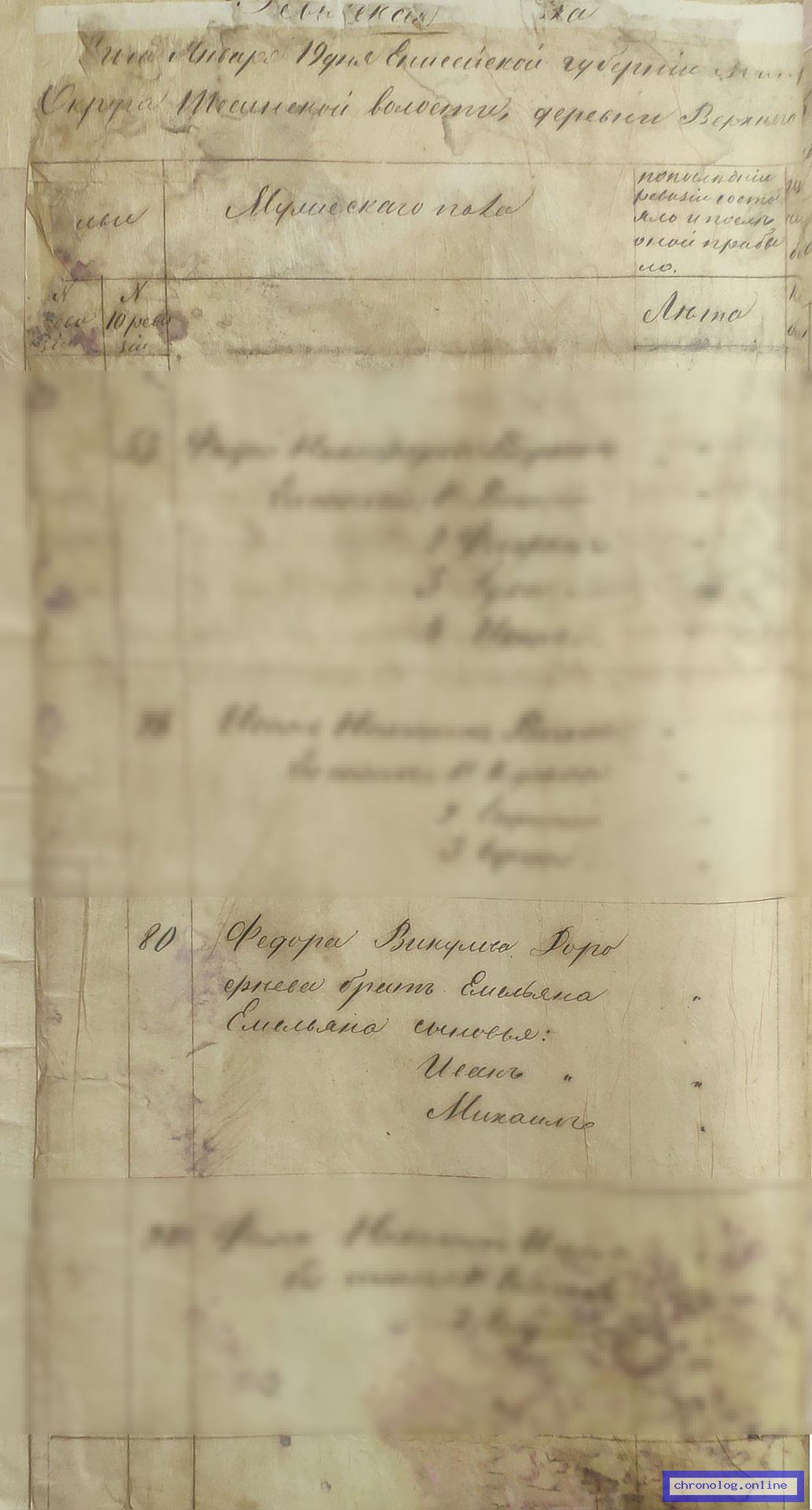 ГАЗК 30-2-270, Л.120об, 142, 249, 249об (Посемейные списки переселенцев на р. Амур): Казак 12-го пешего батальона Афонасий Иванович Фёдоров 44 его жена Орина 32 сыновья Степан 23 Евстафий 18 Павел 15 дочь Акулина 12. Исход: деревня Ераульская Нерчинского уезда. Снимки: 120об, 142, 249, 249об. | |||