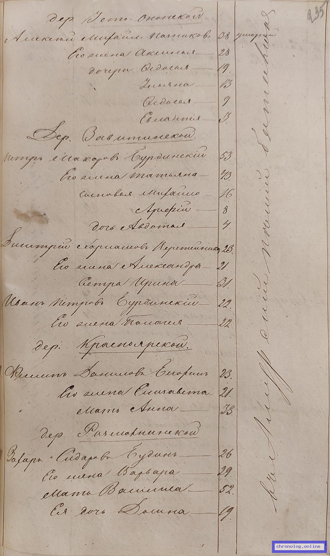 РГИАДВ 704-4-90, Л.17об., 18 (О причислении к сельским обществам Амурской области переселенцев Воронова Ф.Н., Волкова И.Н. и др. в 1865 году): Крестьянин Фёдор Викулович Дорофеев 39 с половиной года. Брата Емельяна умершего жена Анна Николаевна 39 лет, у неё дети: Иван 16 лет, Михаил 2 лет, Пелагея 3 месяца - по данным ревизской сказки 1858 года. Исход: деревня Верхняя Кулибара Тесинской волости Минусинского округа Енисейской губернии. Снимки: 17об, 18. | |||