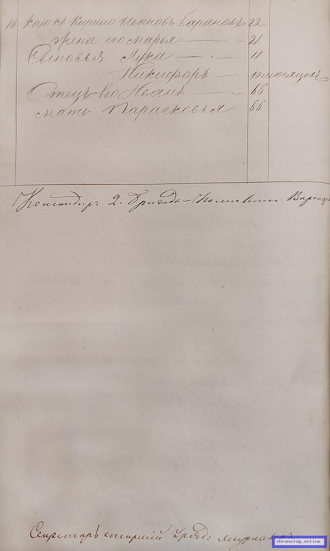 ГАЗК 30-2-270, Л.83, 207, 260об, 275 (Посемейные списки переселенцев на р. Амур): Казак 8-го пешего батальона Кирило Иванович Баранов 22 жена его Марья 21 сыновья Лука 4 Никифор 10 месяцев отец его Иван 66 мать Парасковья 66. Исход: деревня Сарбактуйская Нерчинского уезда. Снимки: 83, 207, 260об, 275. | |||