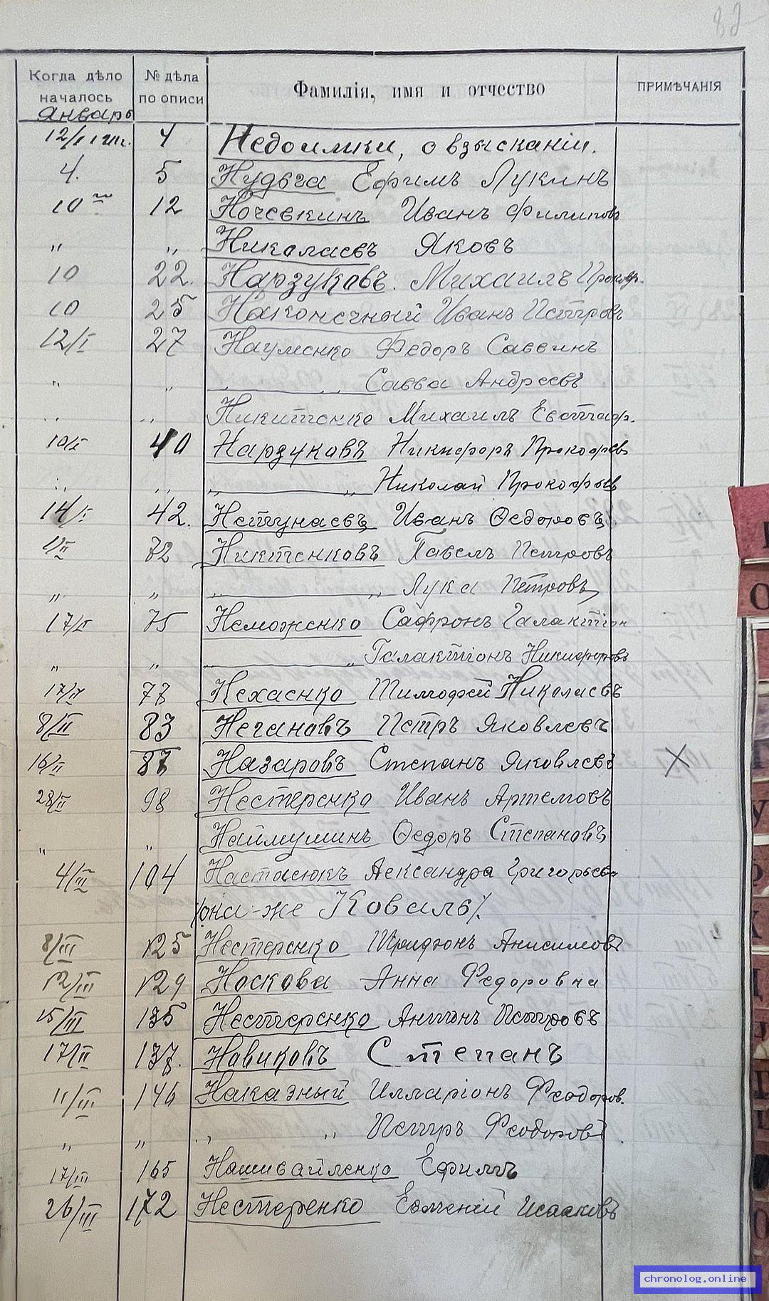 Алфавитный список дел переселенческой части Канцелярии военного губернатора Амурской области за 1911 год (РГИАДВ 704-4-2691, Л.82)