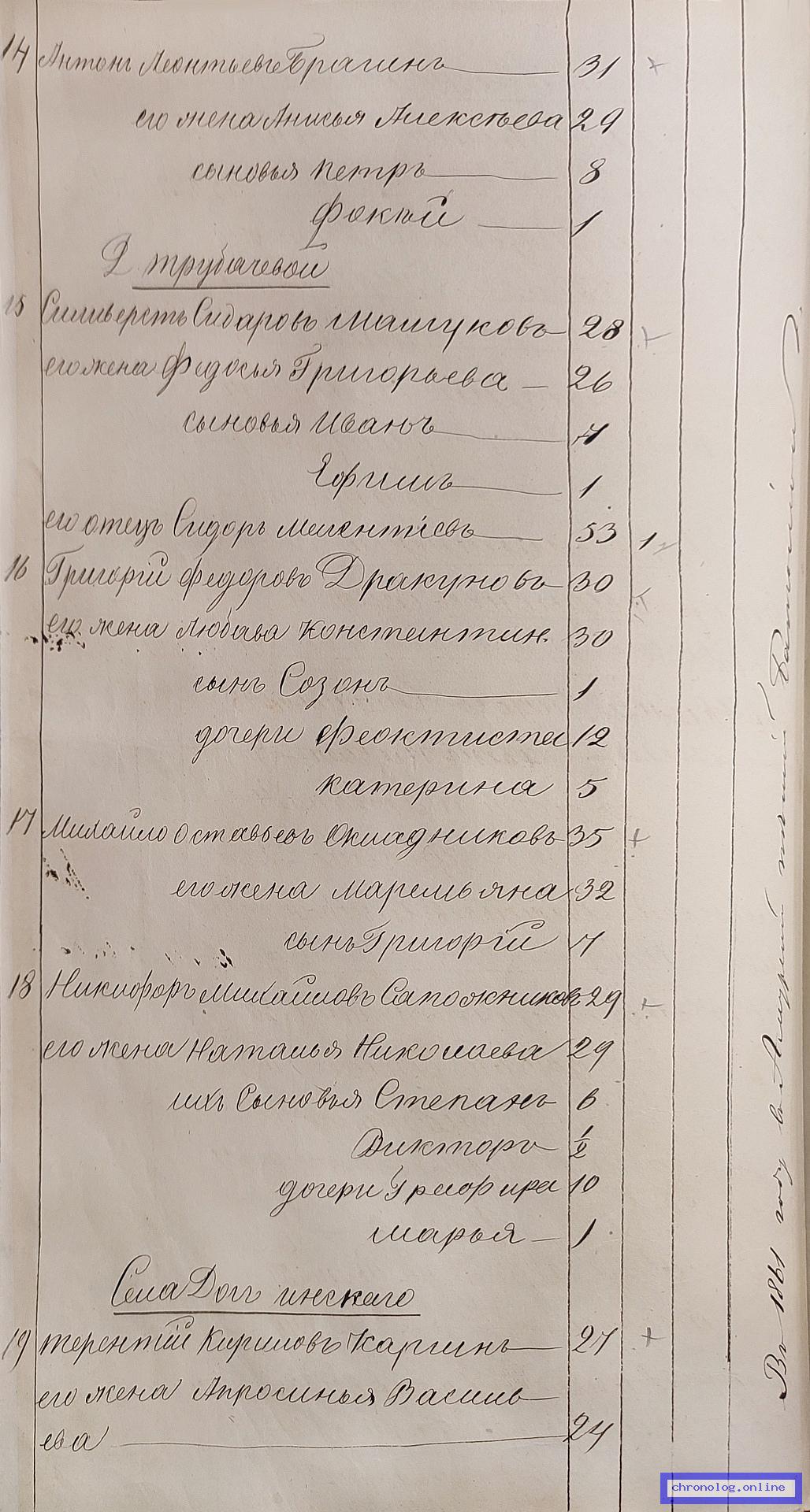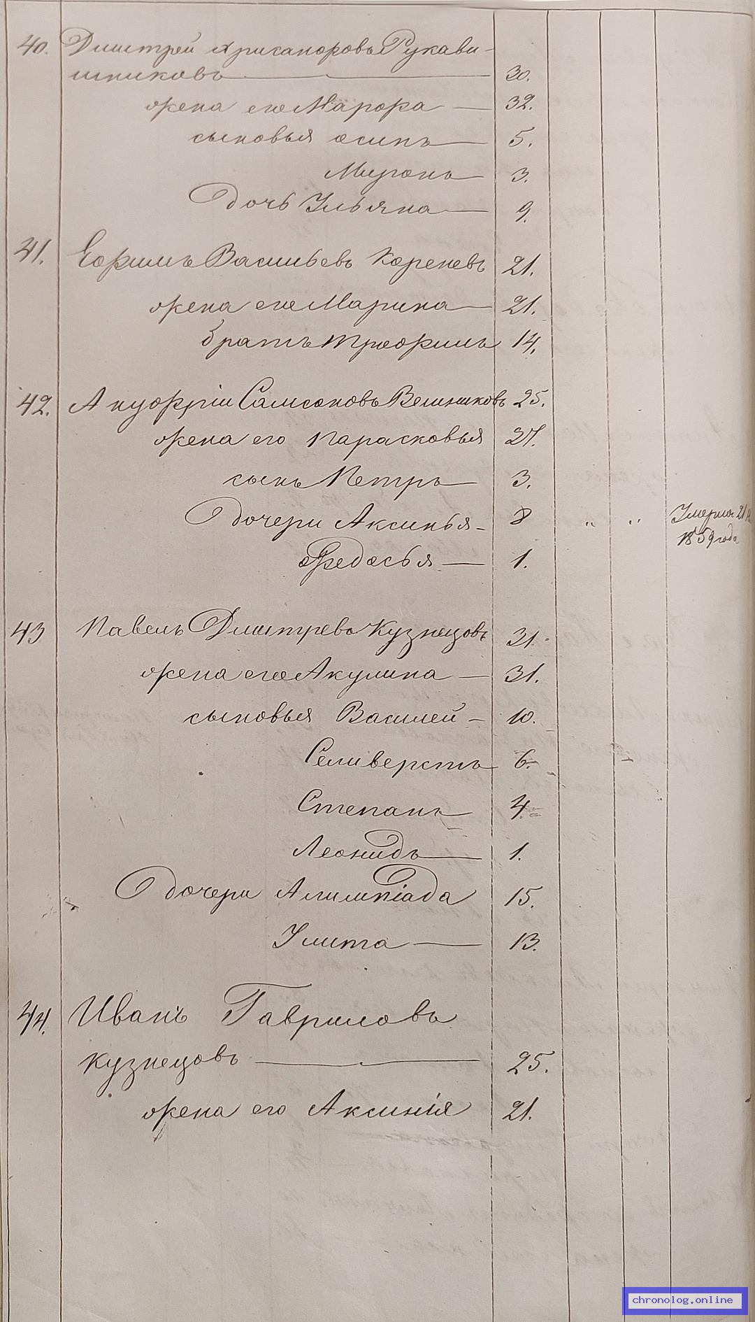 ГАЗК 30-2-270, Л.5об, 149об (Посемейные списки переселенцев на р. Амур): Казак 1-го пешего батальона Ефим Васильевич Коренев 21 жена его Марина 21 брат Трофим 14. Исход: деревня Манкечерская Нерчинского уезда. Снимки: 5об, 149об. | |||