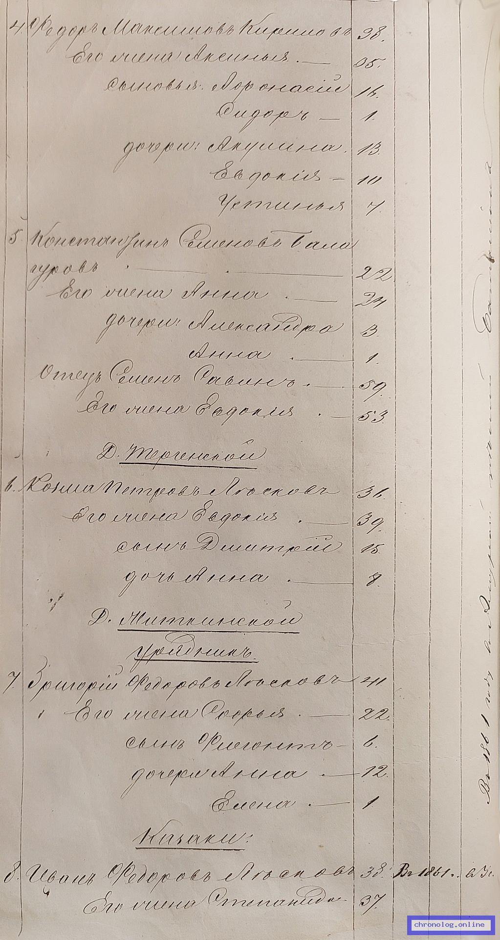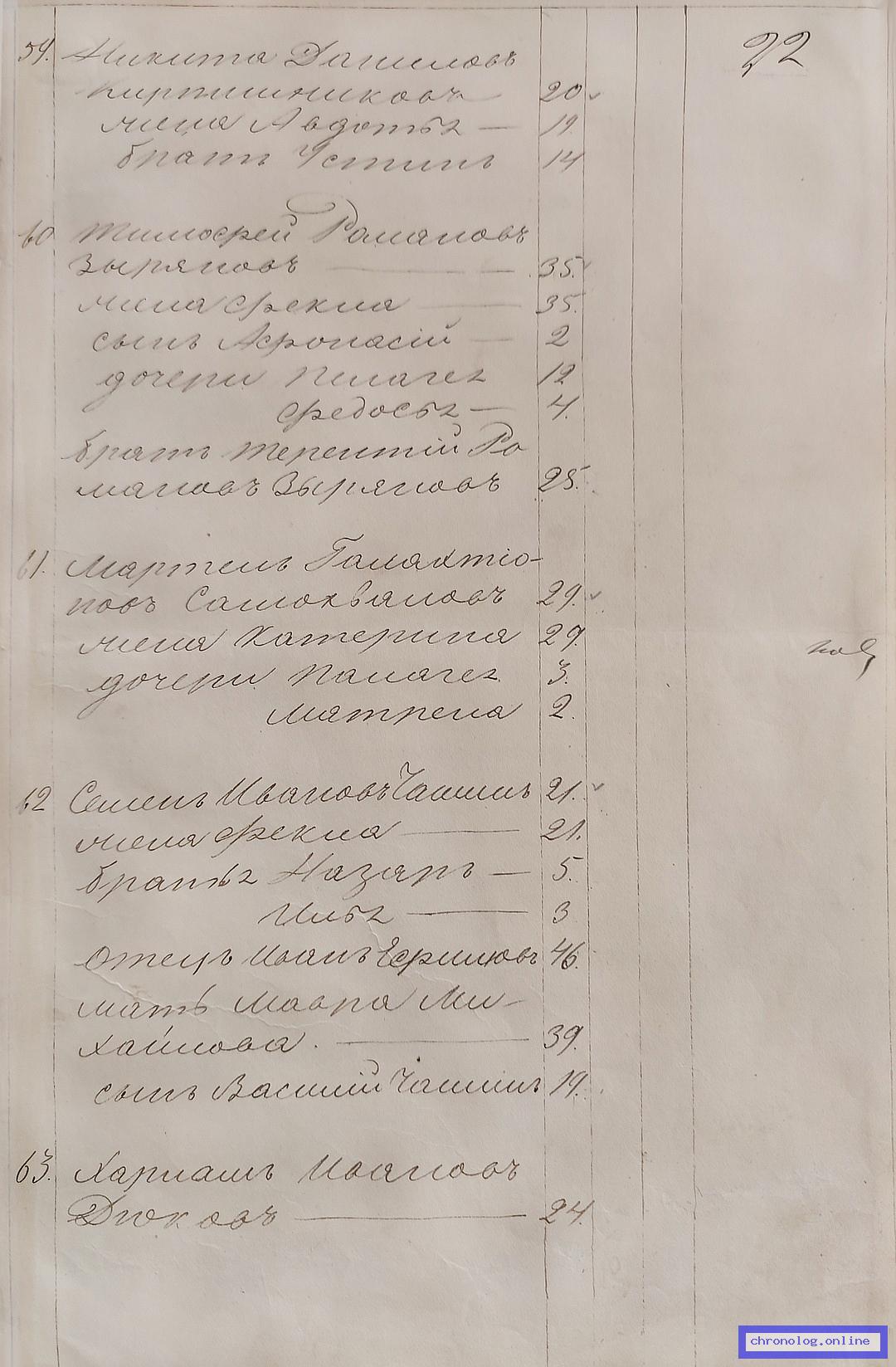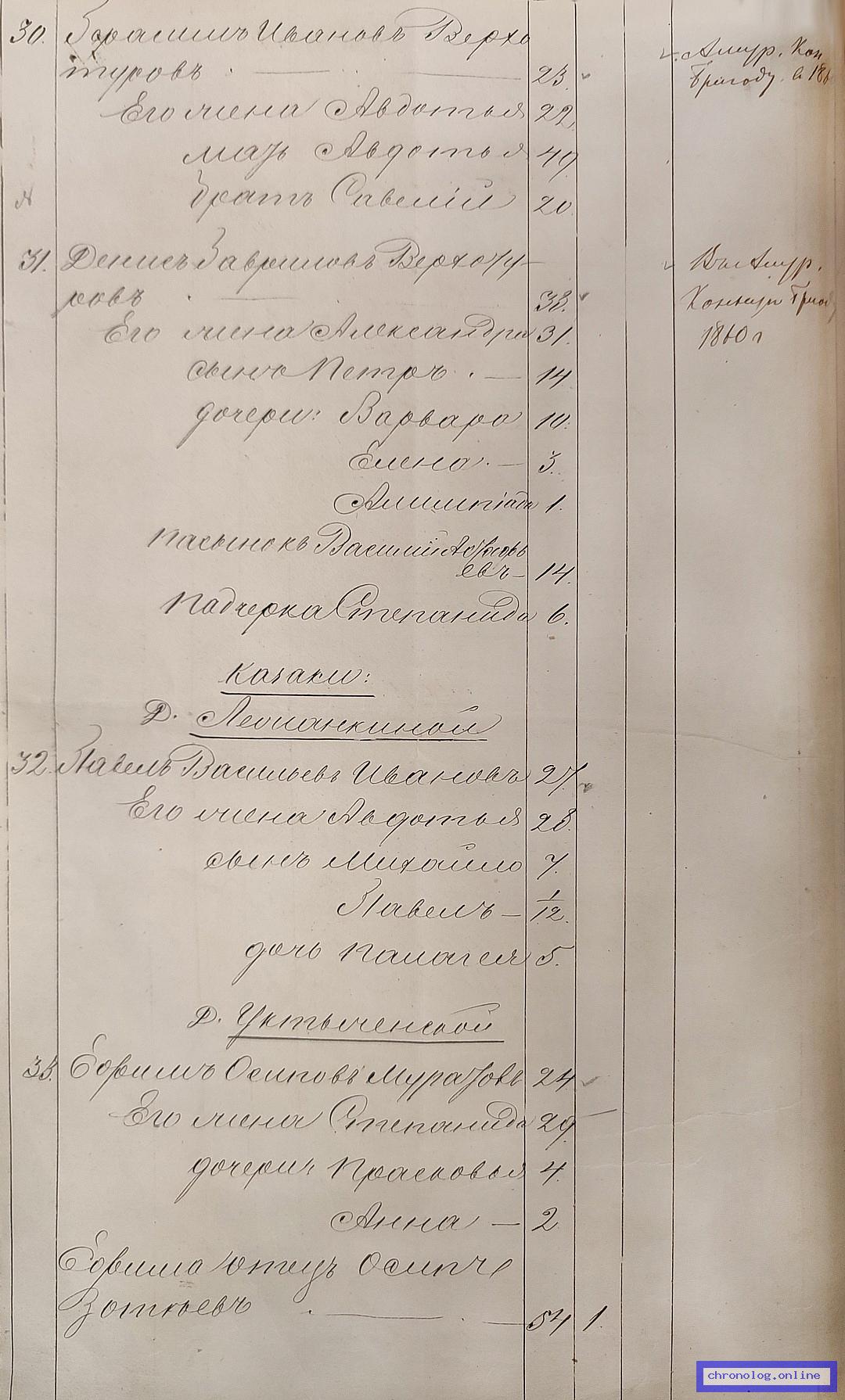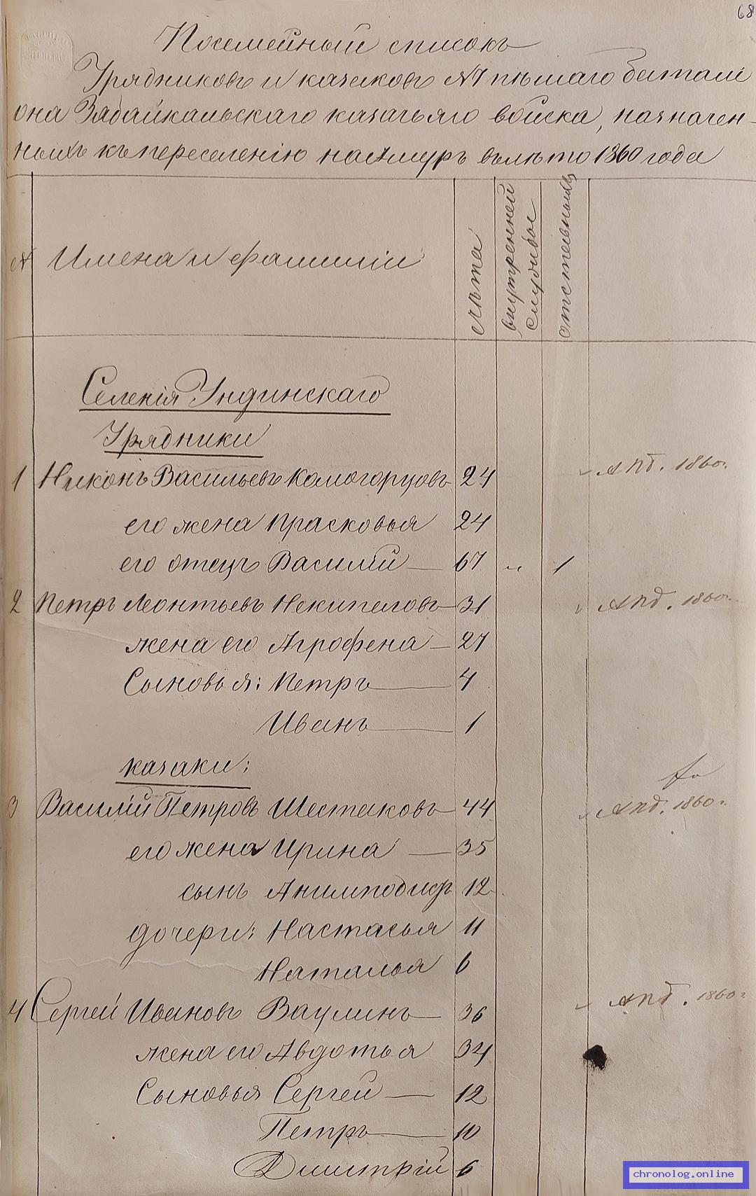 ГАЗК 30-2-270, Л.22, 165об (Посемейные списки переселенцев на р. Амур): Казак 2-го пешего батальона Тимофей Романович Зырянов 35 его жена Фекла 35 сын Афанасий 2 дочери Пелагея 12 Федосья 4 брат Терентий Романович Зырянов 25. Исход: деревня Чашино-Ильдиканская Нерчинского уезда. Снимки: 22, 165об. | |||