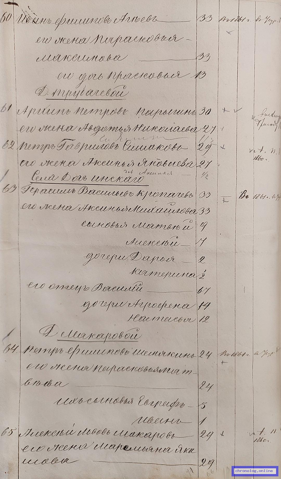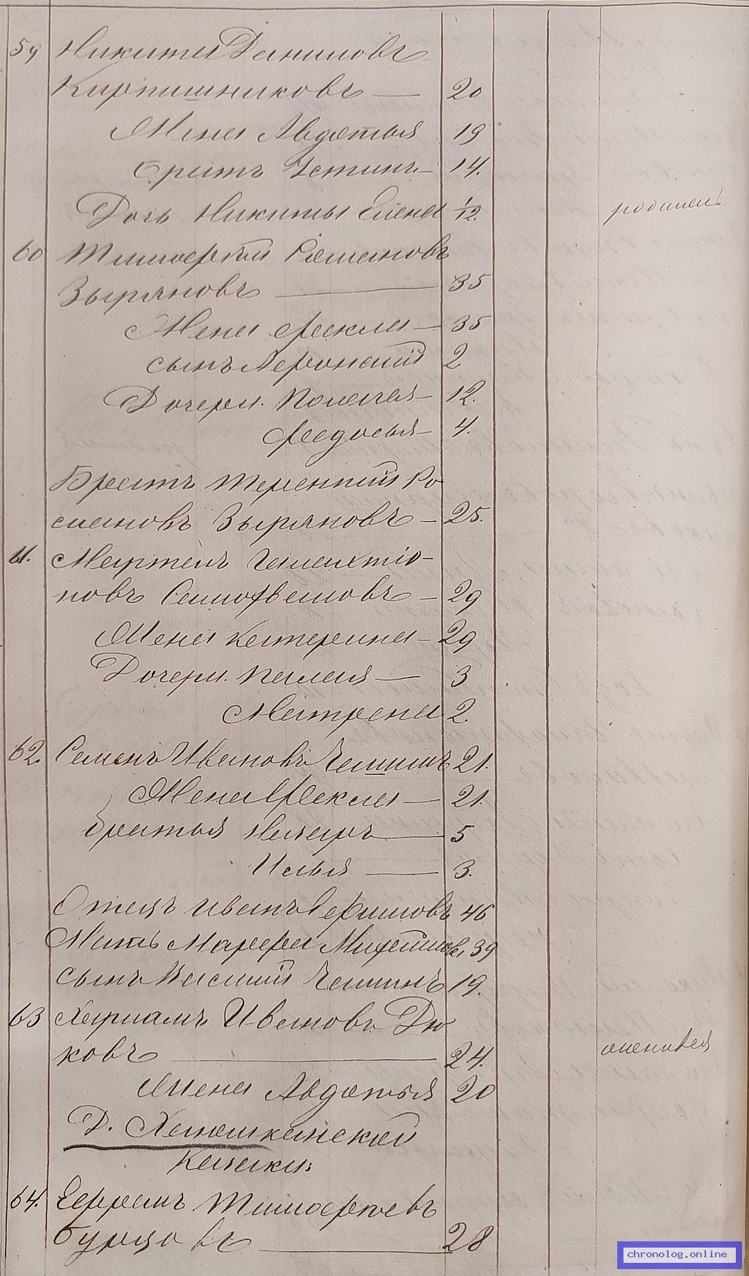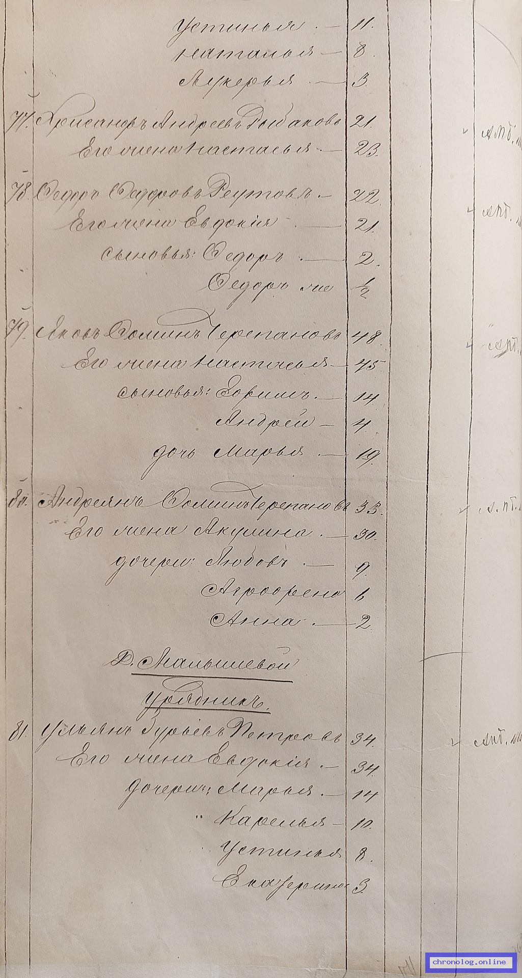 ГАЗК 30-2-270, Л.22, 165об (Посемейные списки переселенцев на р. Амур): Казак 2-го пешего батальона Тимофей Романович Зырянов 35 его жена Фекла 35 сын Афанасий 2 дочери Пелагея 12 Федосья 4 брат Терентий Романович Зырянов 25. Исход: деревня Чашино-Ильдиканская Нерчинского уезда. Снимки: 22, 165об. | |||