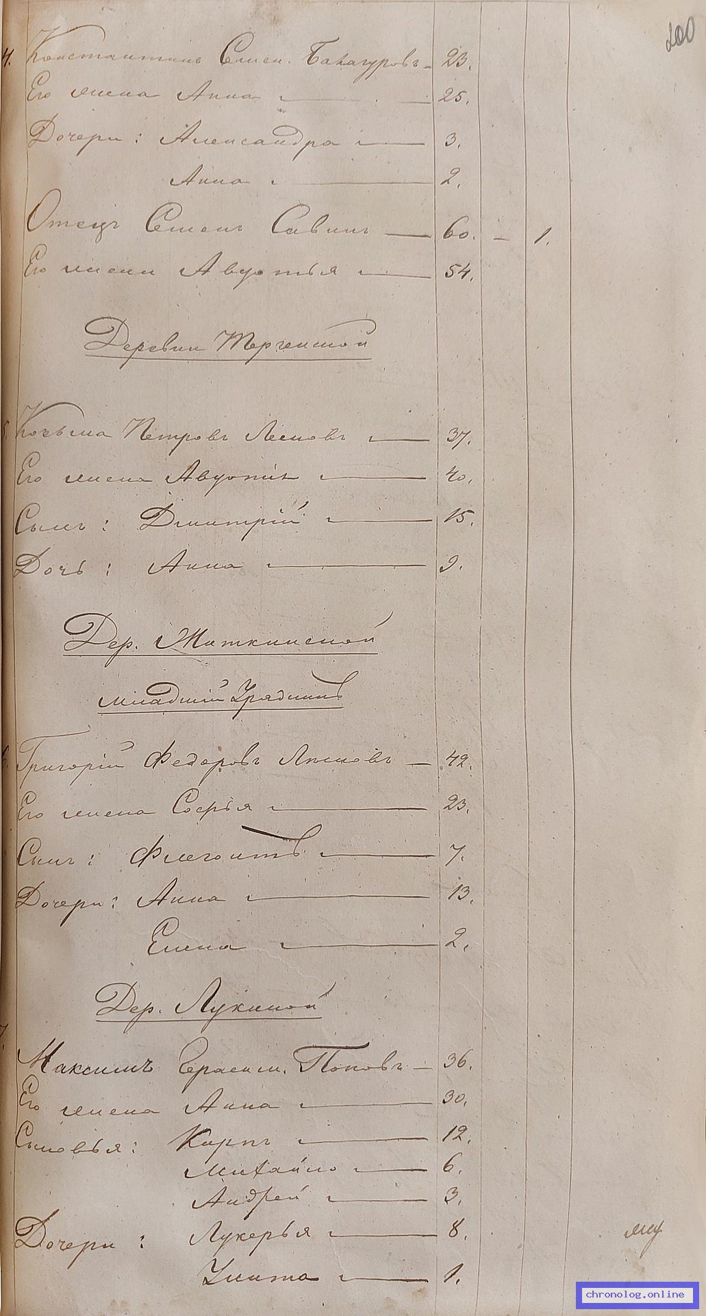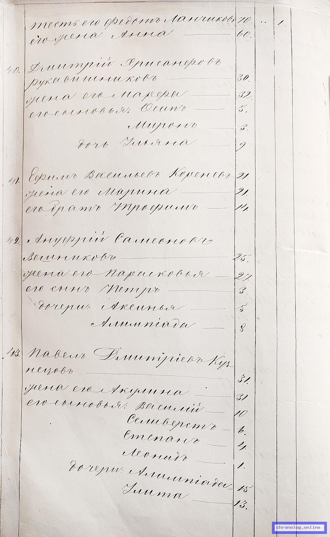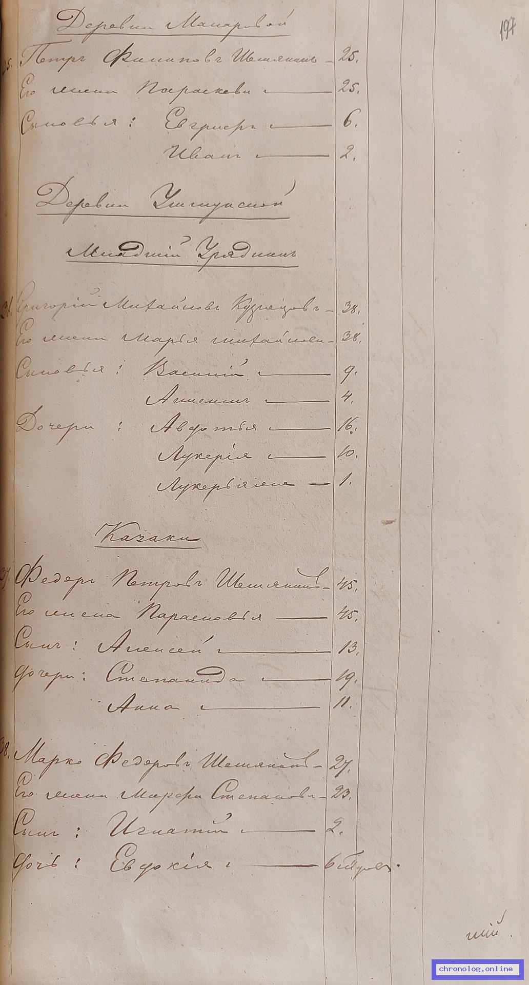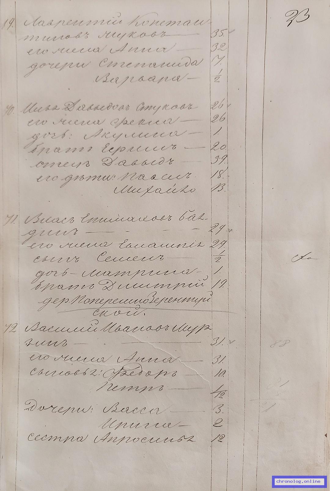 ГАЗК 30-2-270, Л.22, 165об (Посемейные списки переселенцев на р. Амур): Казак 2-го пешего батальона Тимофей Романович Зырянов 35 его жена Фекла 35 сын Афанасий 2 дочери Пелагея 12 Федосья 4 брат Терентий Романович Зырянов 25. Исход: деревня Чашино-Ильдиканская Нерчинского уезда. Снимки: 22, 165об. | |||
