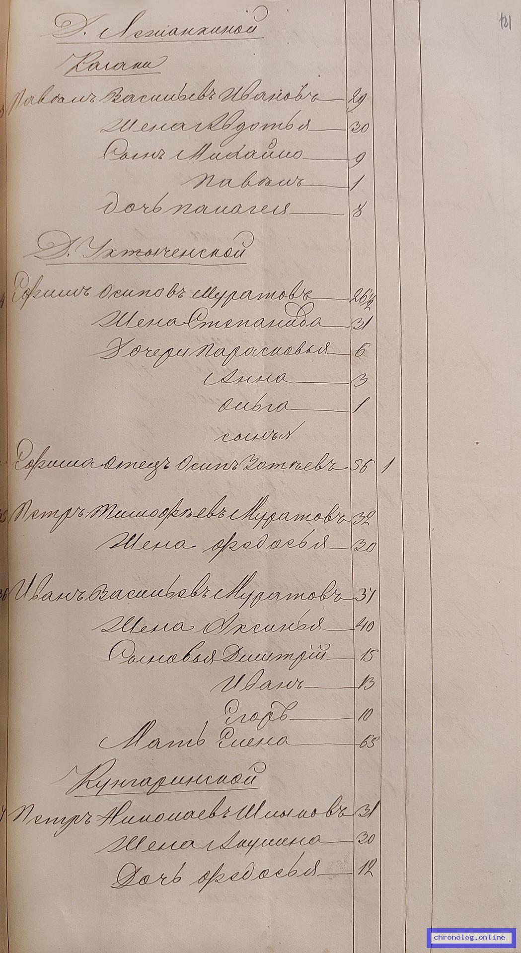 ГАЗК 30-2-270, Л.35об, 181 (Посемейные списки переселенцев на р. Амур): Казак 4-го пешего батальона Ефим Осипович Муратов 26? жена Степанида 31 дочери Парасковья 6 Анна 3 Ольга 1 Ефима отец Осип Зотиевич 56. Исход: деревня Уктыченская Нерчинского уезда. Снимки: 35об, 181. | |||