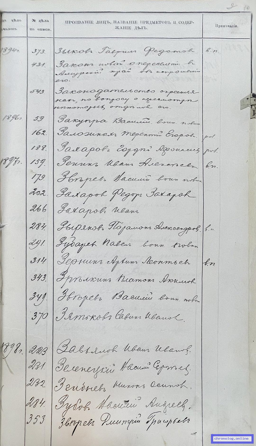 РГИАДВ 704-4-727, Л.10 (Алфавитный список ревизских дел 4-го стола за 1898 год ): Зверев Дмитрий Григорьевич показан со ссылкой на дело №353 (старая опись, нумерация не действительная) за 1898 год. Время и место исхода не показано. Снимки: 10. | ||||