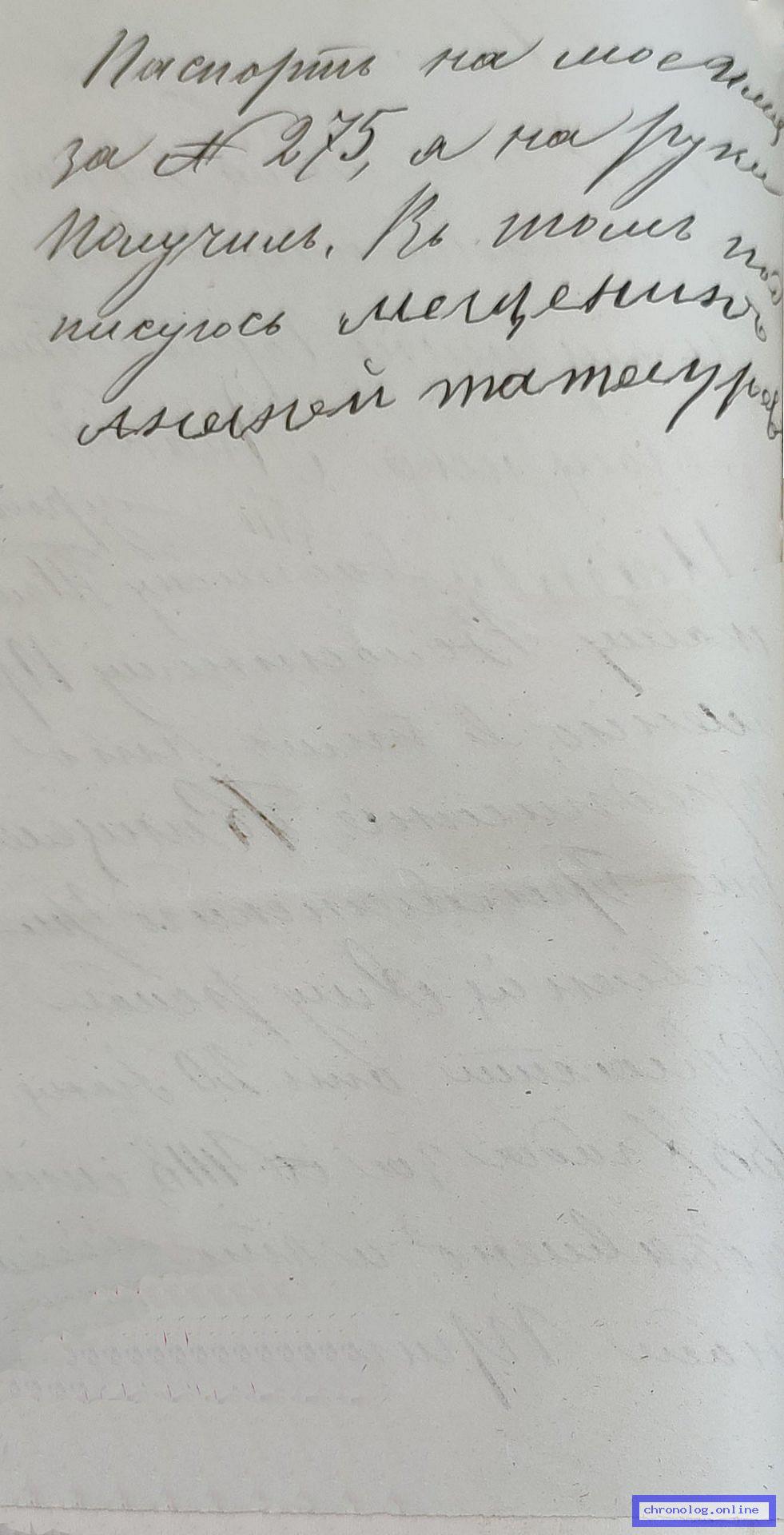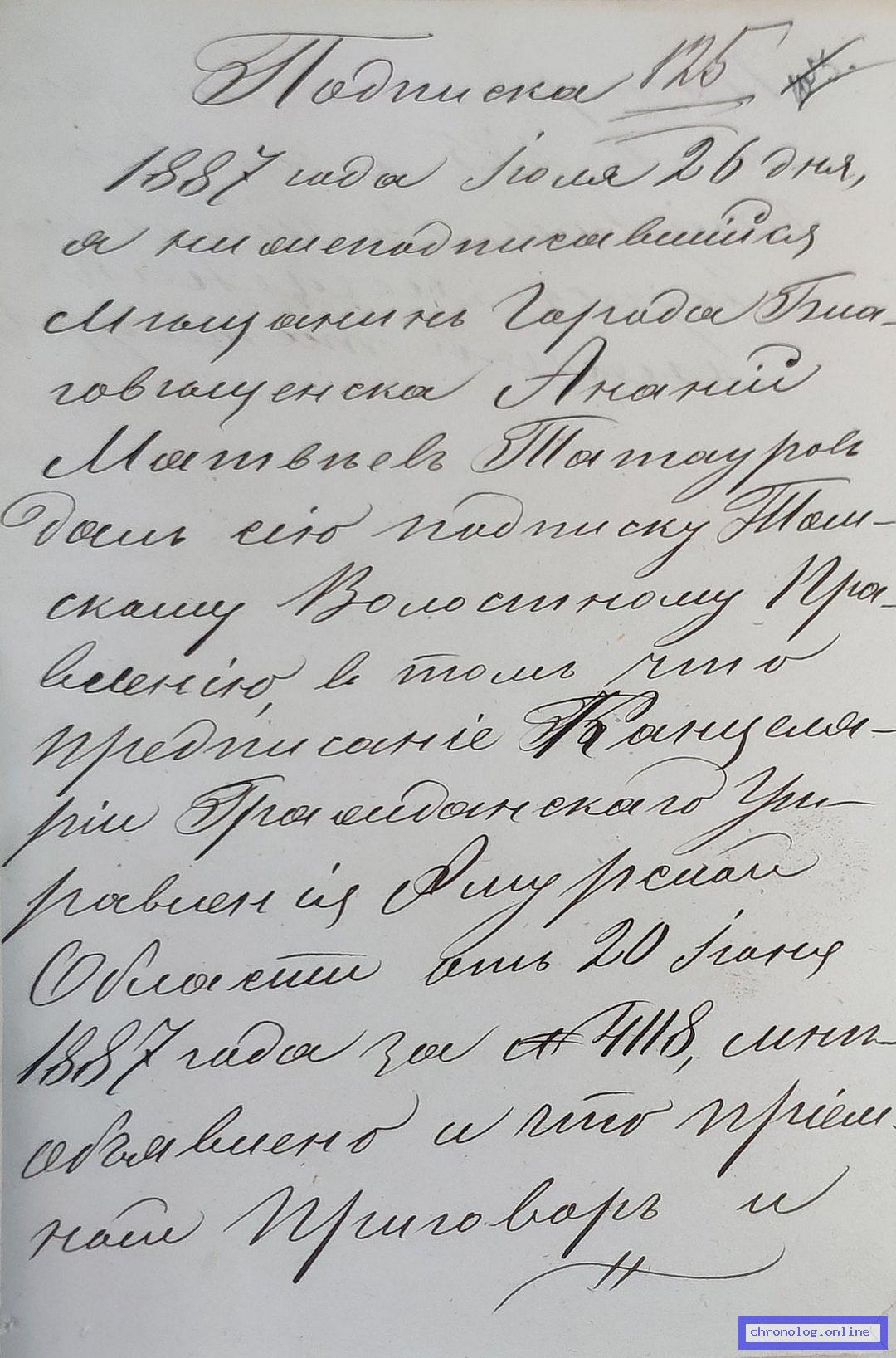 РГИАДВ 704-4-475, Л.125, 125об (Переписка с заведующим крестьяниским переселением в Амурской области о причислении ссыльнопоселенцев и других лиц на 1887 год): Ананий Матвеевич Татауров показан жительствующим в городе Благовещенске Амурской области. Просит 20.06.1887 причислить его к сельскому обществу деревни Заливной. Предписание канцелярии гражданского Управления №4118 от 27.07.1887 ему объявлено и паспорт №275 получен. Исход: город Благовещенск Амурской области. Снимки: 125, 125об. | ||||