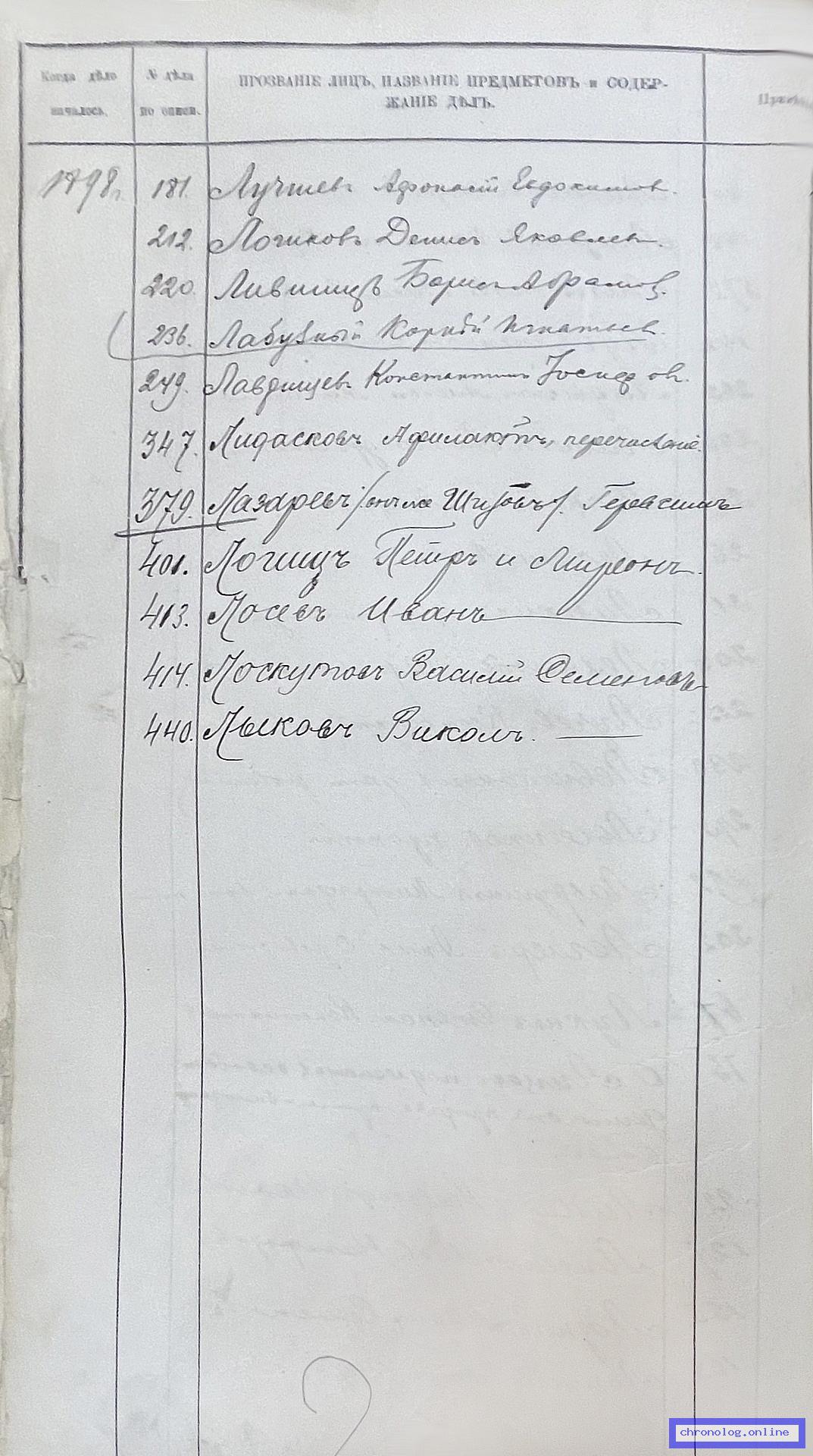 РГИАДВ 704-4-727, Л.15об (Алфавитный список ревизских дел 4-го стола за 1898 год ): Лабузный Корней Игнатьевич показан со ссылкой на дело №236 (старая опись, нумерация не действительная) за 1898 год. Время и место исхода не показано. Снимки: 15об. | ||||