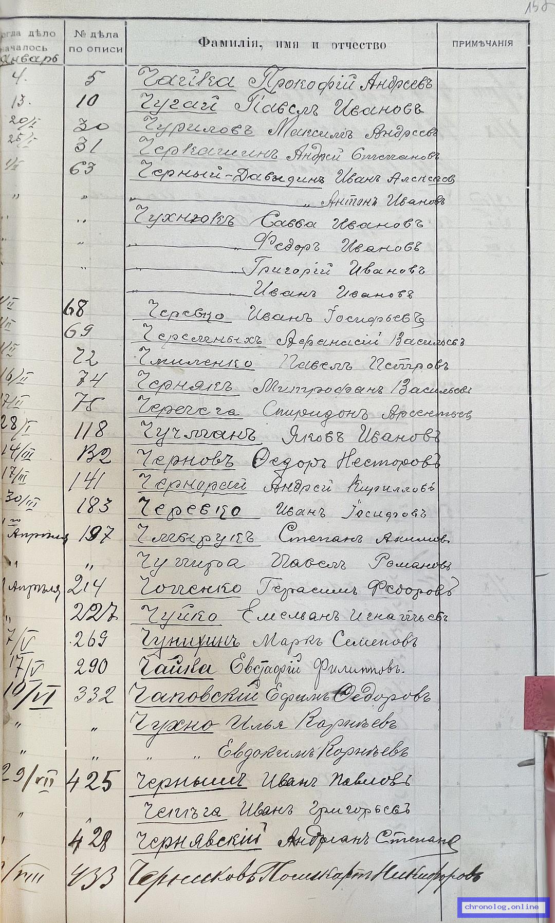 РГИАДВ 704-4-2691, Л.152 (Алфавитный список дел переселенческой части Канцелярии военного губернатора Амурской области за 1911 год): Чугай Павел Иванович показан в деле №10 от 13.1.1911 года (нумерация по старой описи, не действительная). Время и место исхода не показано. Снимки: 152. | ||||
