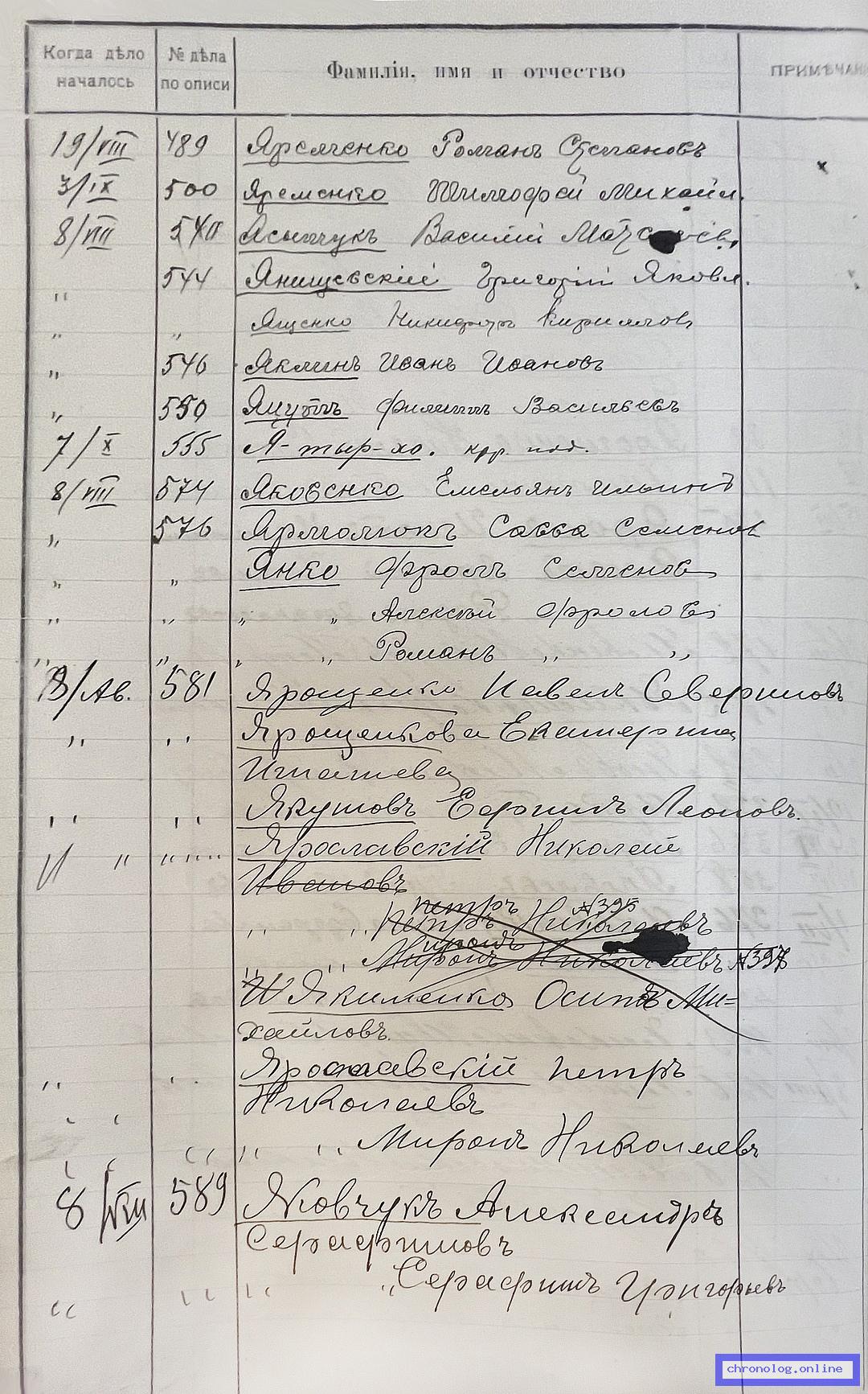 РГИАДВ 704-4-2691, Л.184об (Алфавитный список дел переселенческой части Канцелярии военного губернатора Амурской области за 1911 год): Ященко Никифор Кириллович показан в деле №544 от 8.8.1911 года (нумерация по старой описи, не действительная). Время и место исхода не показано. Снимки: 184об. | ||||