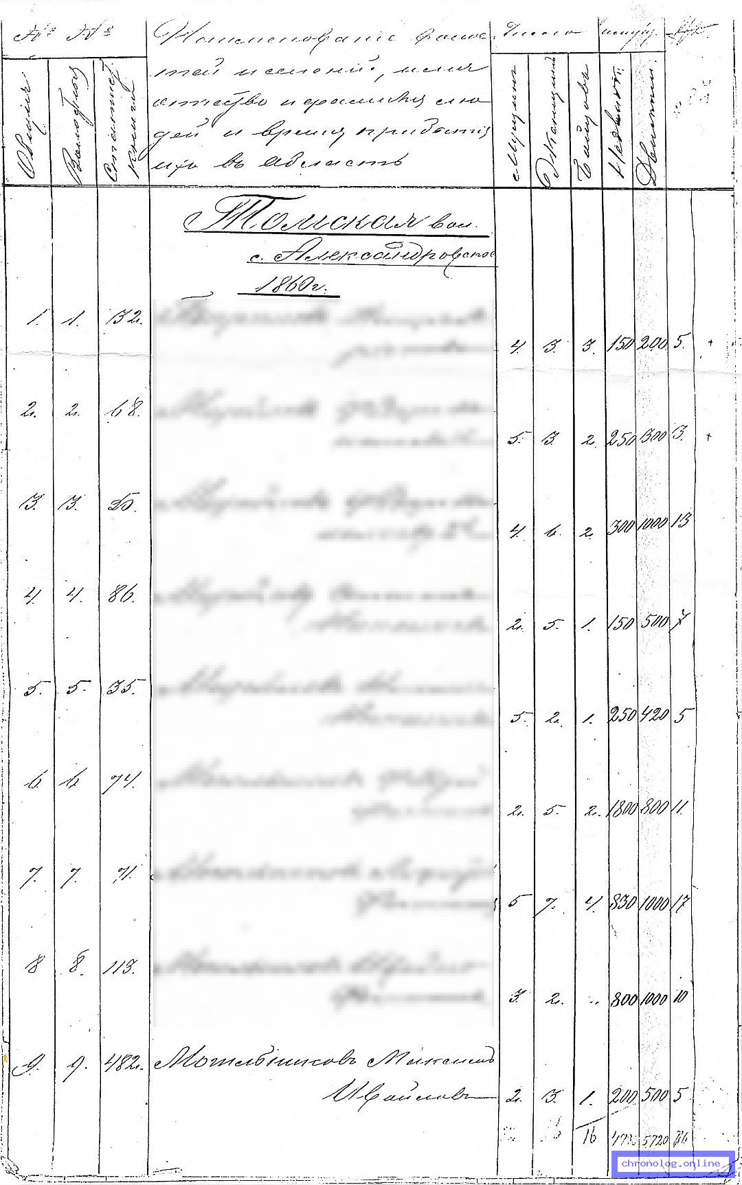 РГИАДВ 704-4-498, Л.206 (Отчёт заведующего переселением о движении переселенцев из Томской губернии за 1888 год): Могильников Максим Ивайлович показан в таблице с указанием числа мужчин, женщин и бойцов в семье, стоимостью недвижимого и движимого имущества (руб.), числе засеянных десятин, жительствующим в село Александровское (Томская волость) с 1860 года. Время и место исхода не показано. Снимки: 206. | ||||