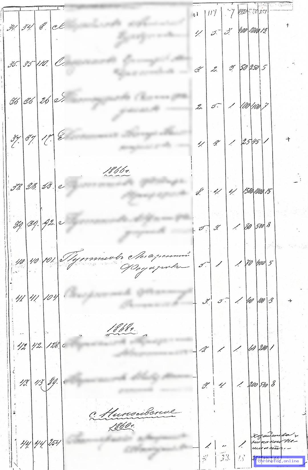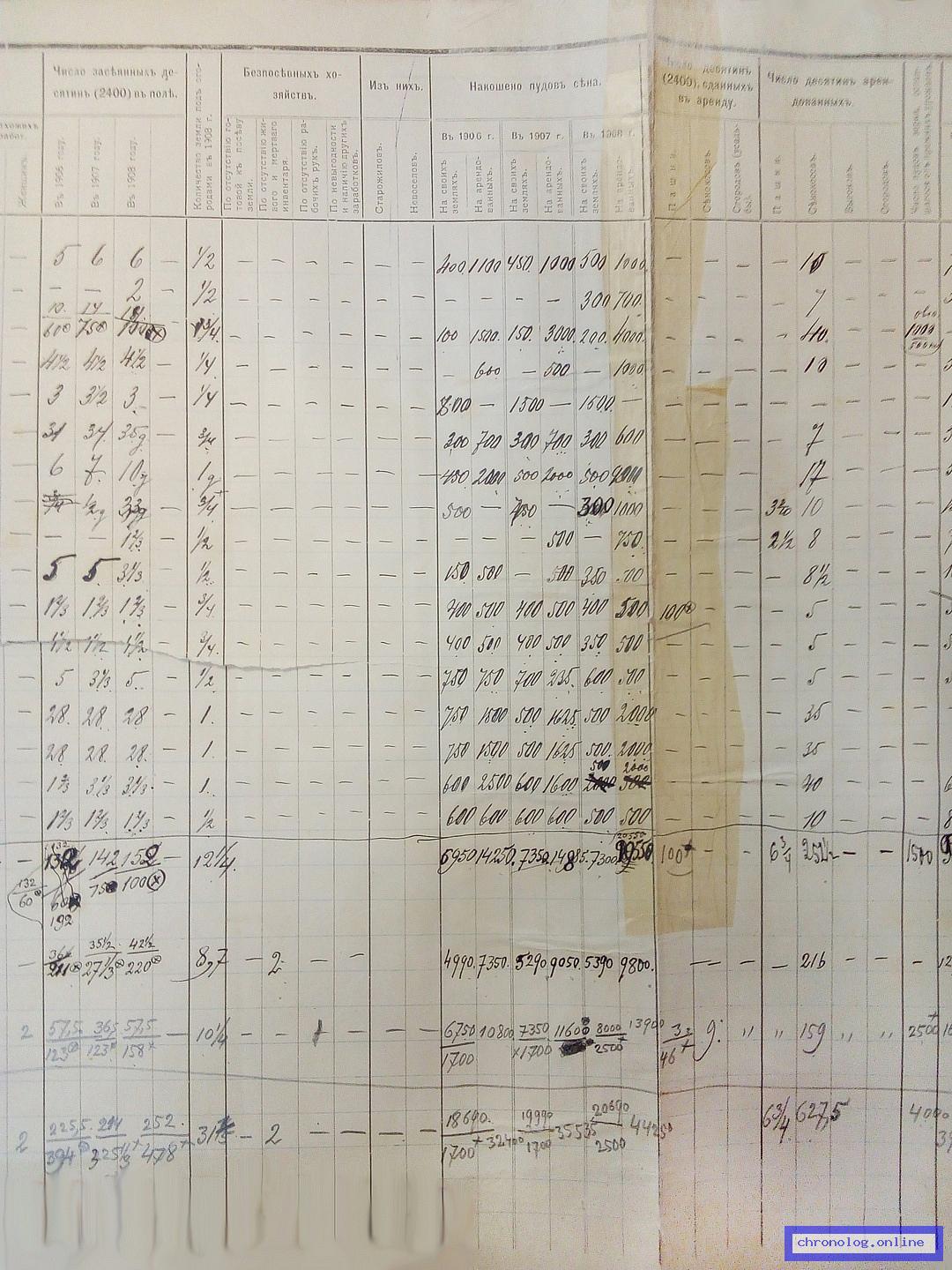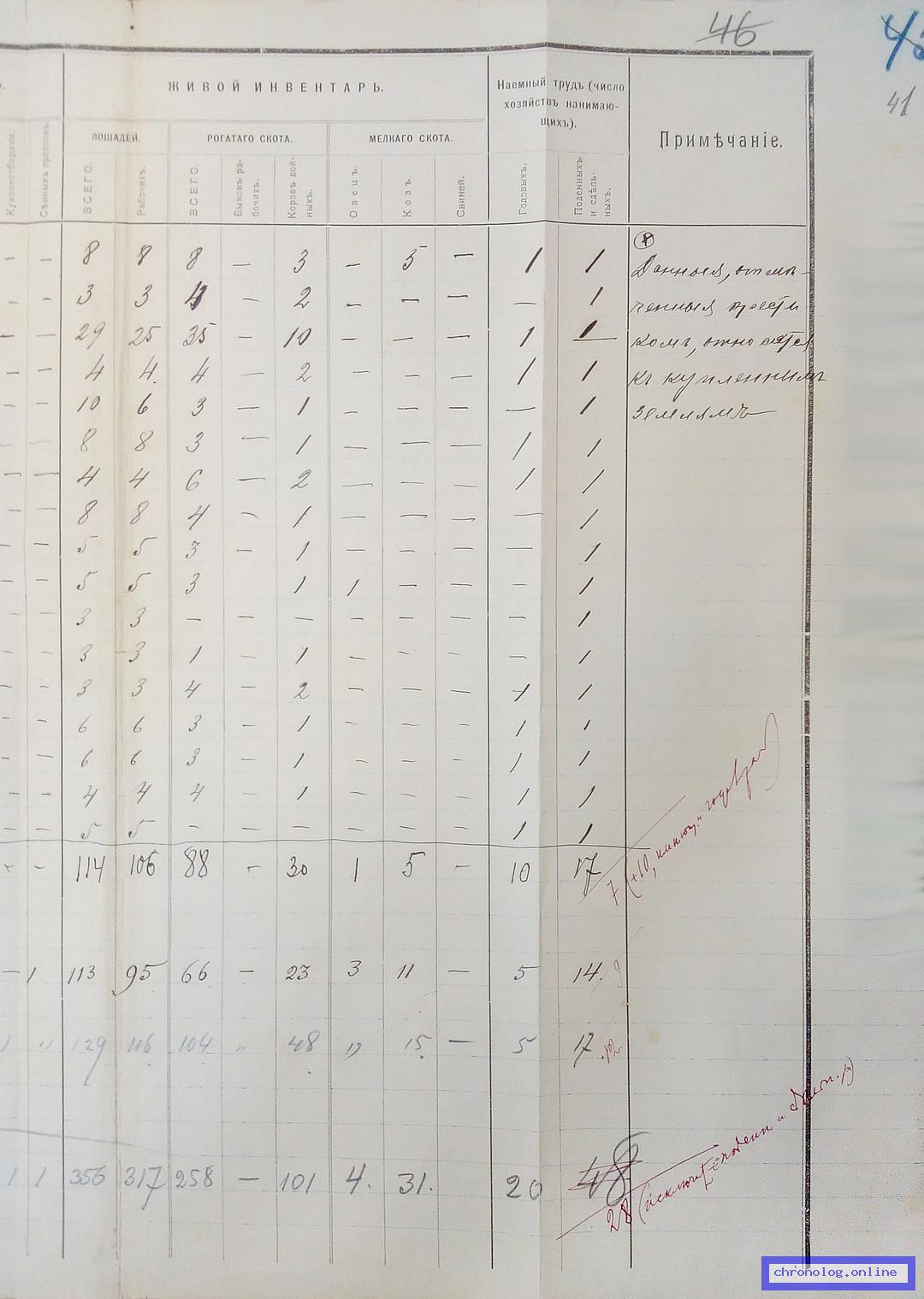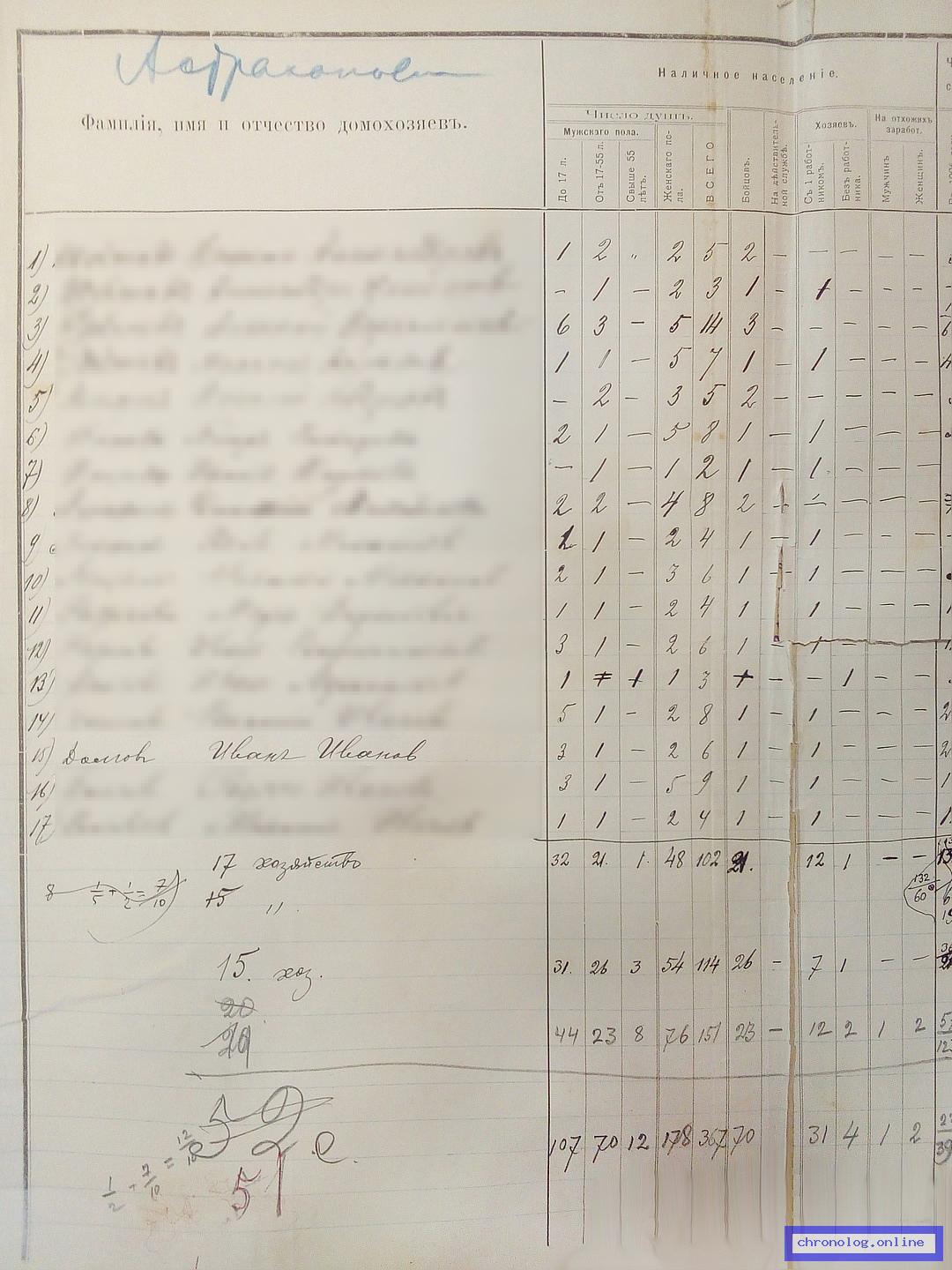 РГИАДВ 702-5-208, Л.41 (Статистико-экономическое обследование населения за 1909 год): В сводной таблице о состоянии хозяйства (число душ мужчин до 17, от 17 до 55, старше 55, женщин, бойцов, числе засеянных десятин в поле, безпосевных хозяйствах, накошено пудов сена, число десятин сданных в аренду, арендованных, покупке хлеба, мёртвый и живой инвентарь, наёмный труд и примечания) показан Иван Иванович Долгов из деревни Астраханки. Время и место исхода не показано. Снимки: 41, 41а, 41б, 41в. | ||||
