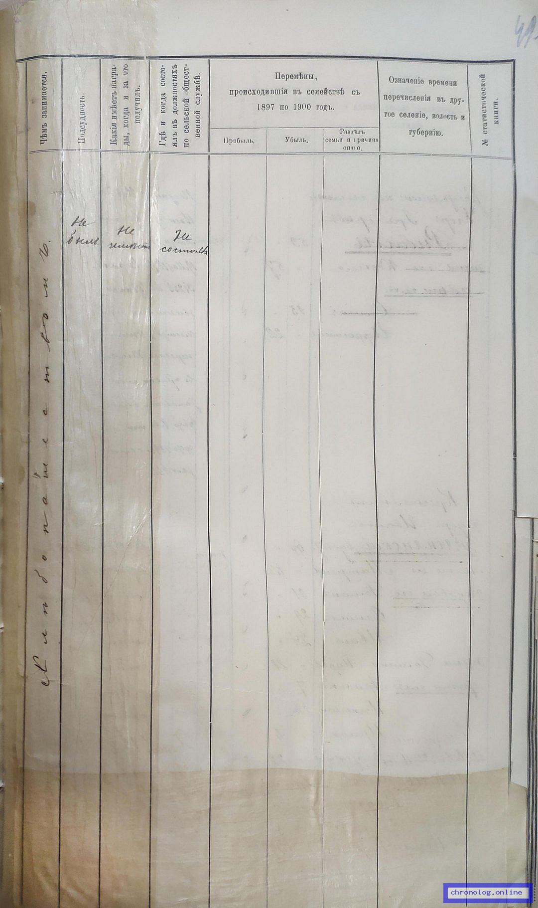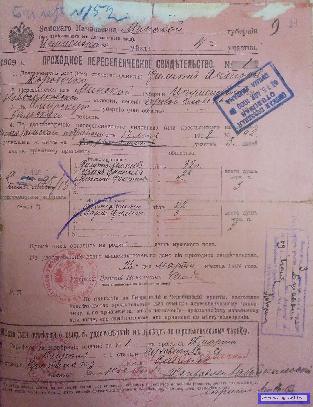 Известно, что: Постановлением Военного Губернатора Амурской области №359 от 3 октября 1900 года семья причислена к обществу д.Бичура Краснояровской волости Амурской области. Возможно отселились из д. Николаевка Бельской волости Амурской области в 1895-1900 году. Необходимо выяснить: Необходимо найти и оцифровать ходаческое свидетельство, дело переселенца. Предполагаемые архивы для поиска: РГИАДВ (Владивосток). | ||||
