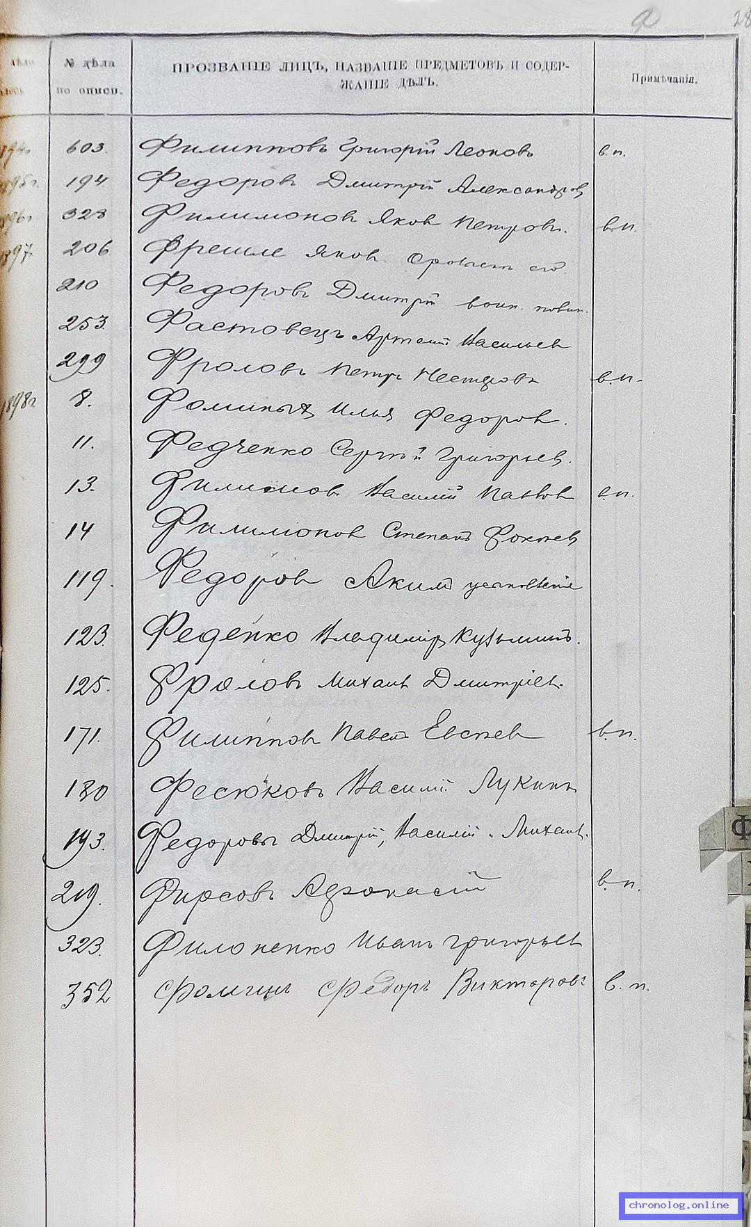 РГИАДВ 704-4-727, Л.28 (Алфавитный список ревизских дел 4-го стола за 1898 год ): Фёдоров Дмитрий показан со ссылкой на дело №210, 193 (старая опись, нумерация не действительная) за 1897, 1898 год о воинской повинности и причислении. Время и место исхода не показано. Снимки: 28. | ||||