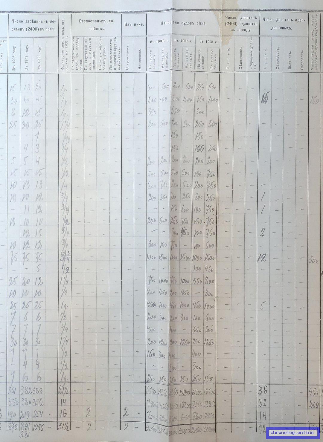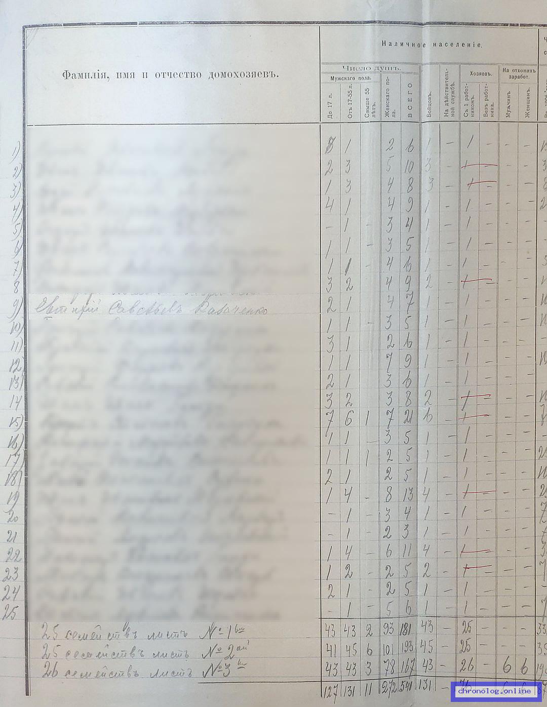 РГИАДВ 702-5-208, Л.283 (Статистико-экономическое обследование населения за 1909 год): В сводной таблице о состоянии хозяйства (число душ мужчин до 17, от 17 до 55, старше 55, женщин, бойцов, числе засеянных десятин в поле, безпосевных хозяйствах, накошено пудов сена, число десятин сданных в аренду, арендованных, покупке хлеба, мёртвый и живой инвентарь, наёмный труд и примечания) показан Евтихий Савельевич Казаченко из деревни Коршуновки. Время и место исхода не показано. Снимки: 283, 283а, 283б, 283в. | ||||