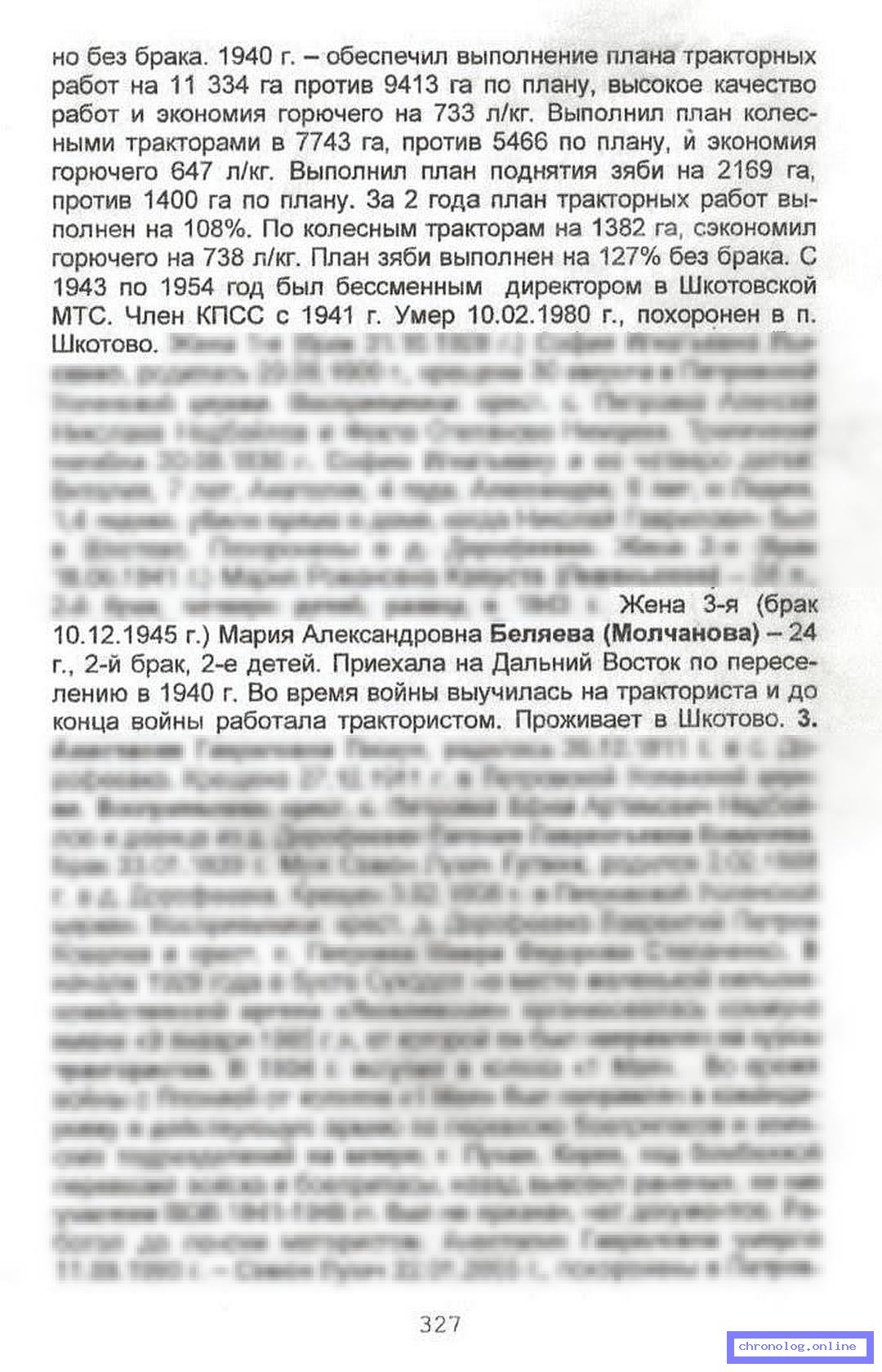 Разное ГИ-ГС-ОШР4, стр.327 (Ольгинско-шкотовский родословец. Книга четвёртая): Жена Николая Гавриловича Пискуна Мария Александровна Беляева *1921. Бракосочетание произошло 10.12.1945. Время и место исхода требует дополнительного исследования. Снимки: 321, 326, 327. | ||||
