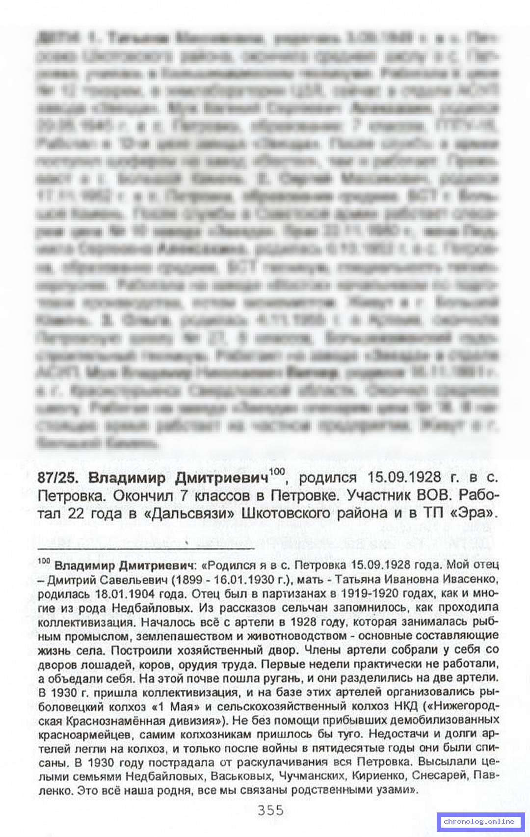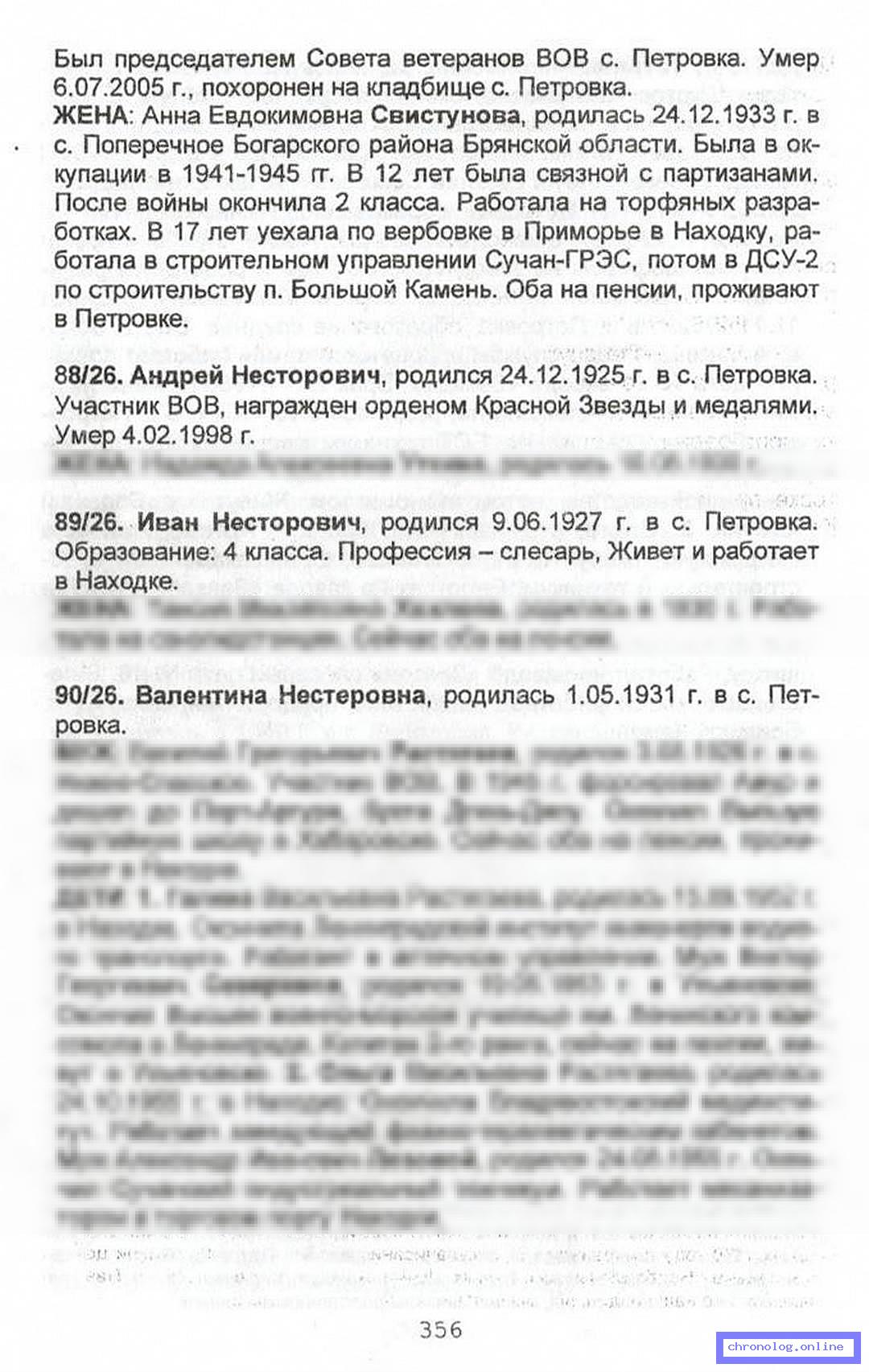 Разное ГИ-ГС-ОШР4, стр.355, 356 (Ольгинско-шкотовский родословец. Книга четвёртая): Жена Владимира Дмитриевича Недбайлова Анна Евдокимовна Свистунова *24.12.1933. Исход: село Поперечное Богарского района Брянской области. Снимки: 321, 355, 356. | ||||