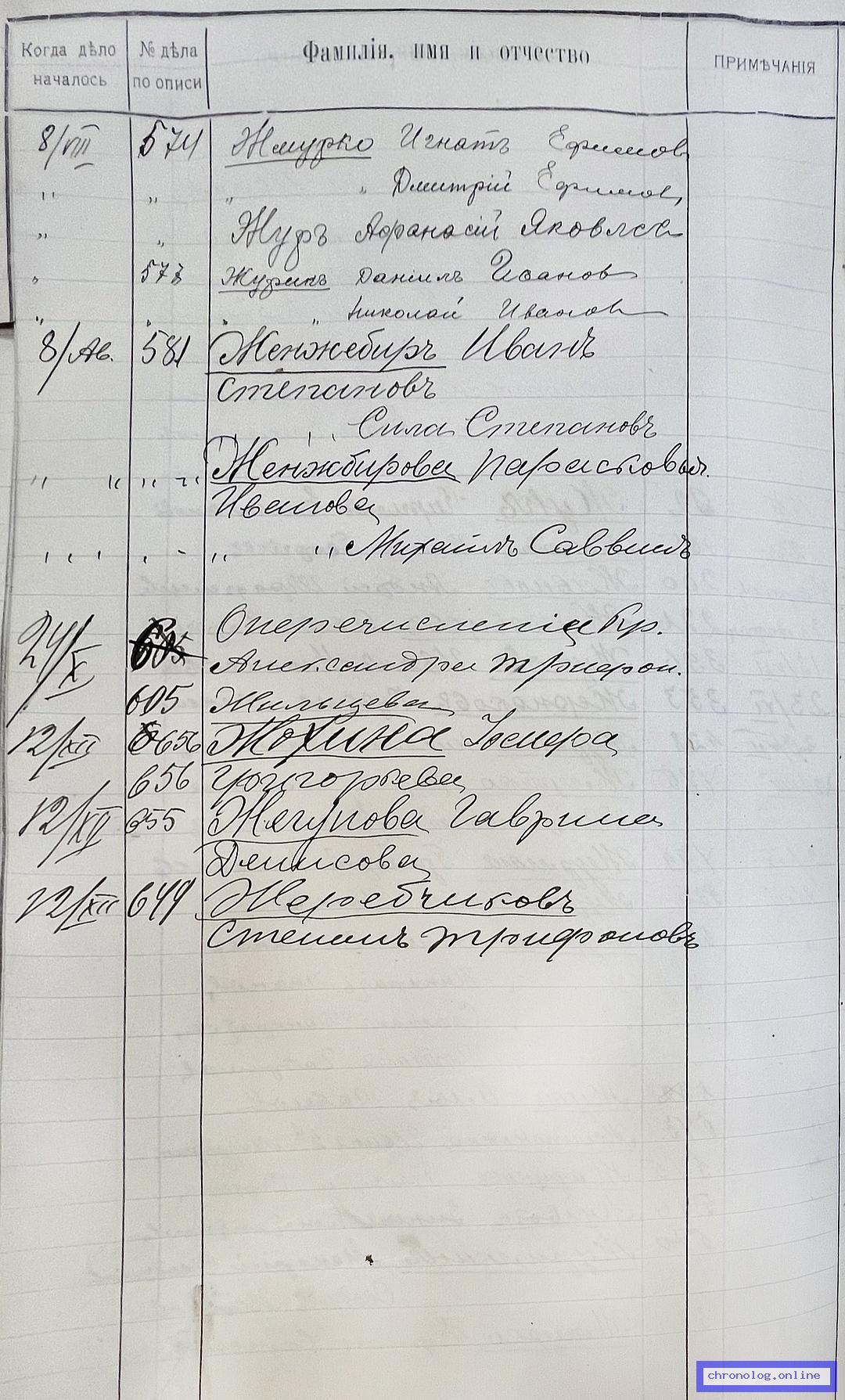 РГИАДВ 704-4-2691, Л.37 (Алфавитный список дел переселенческой части Канцелярии военного губернатора Амурской области за 1911 год): Жмурко Ефим Семёнович показан в деле №574 от 8.8.1911 года (нумерация по старой описи, не действительная). Время и место исхода не показано. Снимки: 37. | ||||