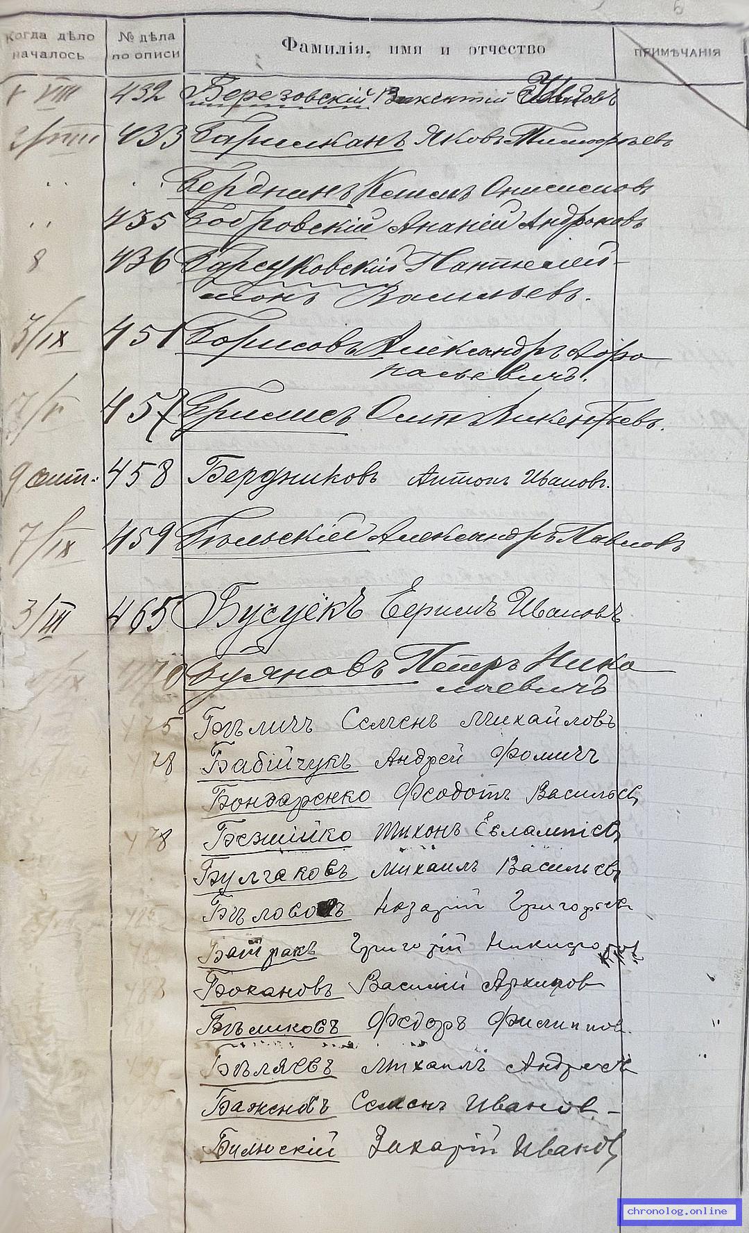 РГИАДВ 704-4-727, Л.7 (Алфавитный список ревизских дел 4-го стола за 1898 год ): Денысюк Анна показан со ссылкой на дело №214 (старая опись, нумерация не действительная) за 1897 год о розыске. Время и место исхода не показано. Снимки: 7. | ||||
