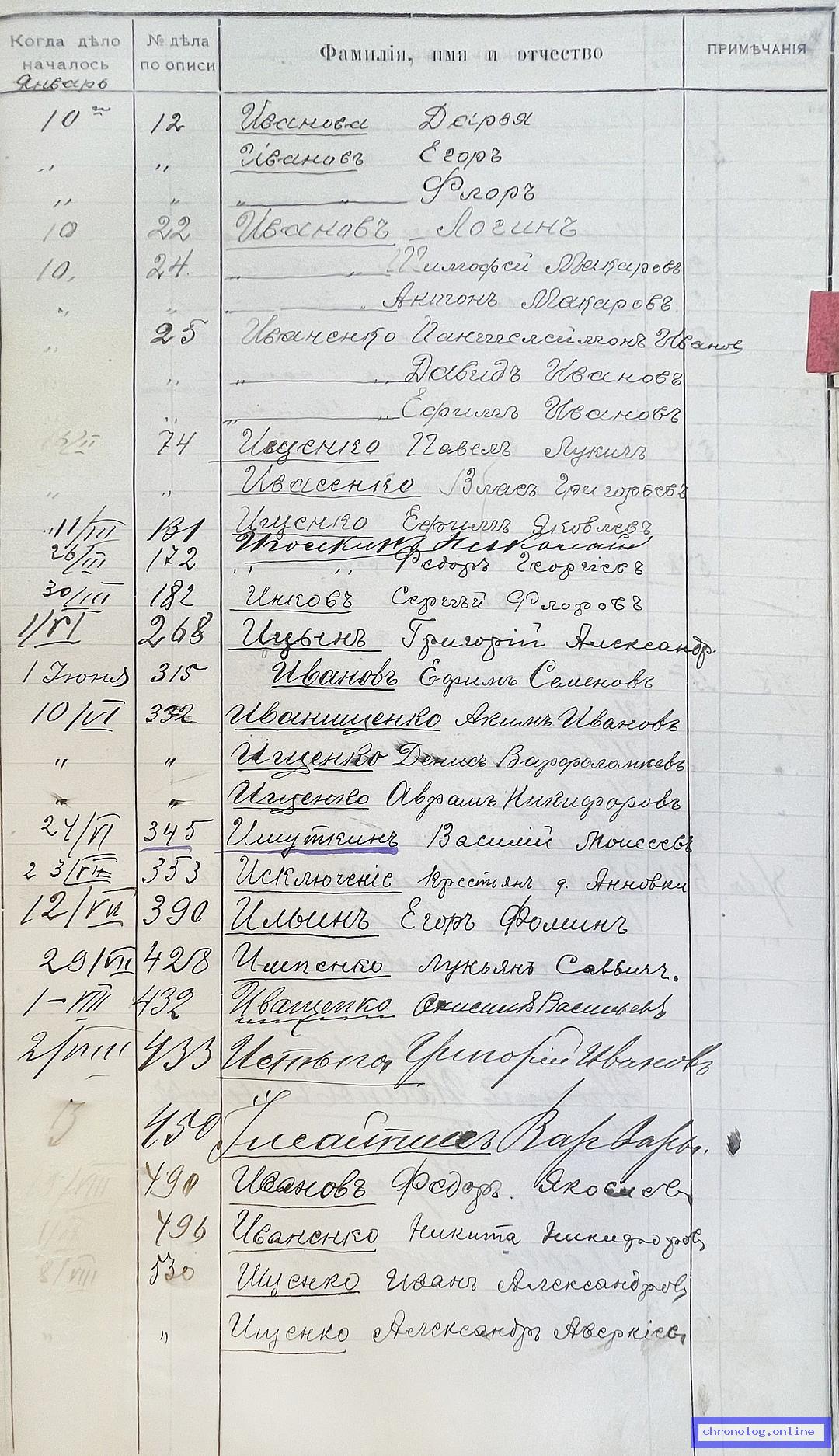РГИАДВ 704-4-2691, Л.51 (Алфавитный список дел переселенческой части Канцелярии военного губернатора Амурской области за 1911 год): Иванов Фёдор Яковлевич показан в деле №490 от 19.8.1911 года (нумерация по старой описи, не действительная). Время и место исхода не показано. Снимки: 51. | ||||