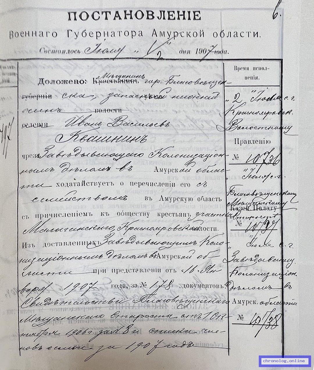 РГИАДВ 704-4-1392, Л.1, 3, 6-7 (О причислении к сельскому обществу с. Малыгинского Краснояровской волости Квашнина И. В. за 1907 год): Мещанин города Благовещенска, запасной нижний чин Иван Васильевич Квашнин 35 лет с женой Наталией Марковной 25 лет и детьми Гавриилом 3 лет, Иваном 2 лет, Харитиной 5 лет по свидетельству Благовещенского мещанского старосты от 01.09.1906 за №8 были уволены для причисления в крестьяне Амурской области. Постановлением Военного губернатора Амурской области №407 от 01.07.1907 причислены на участок Малыгинский Краснояровской волости с первой половины 1907 года. Исход: город Благовещенск Амурской области. Снимки: 1, 3, 6, 6об, 7. | ||||