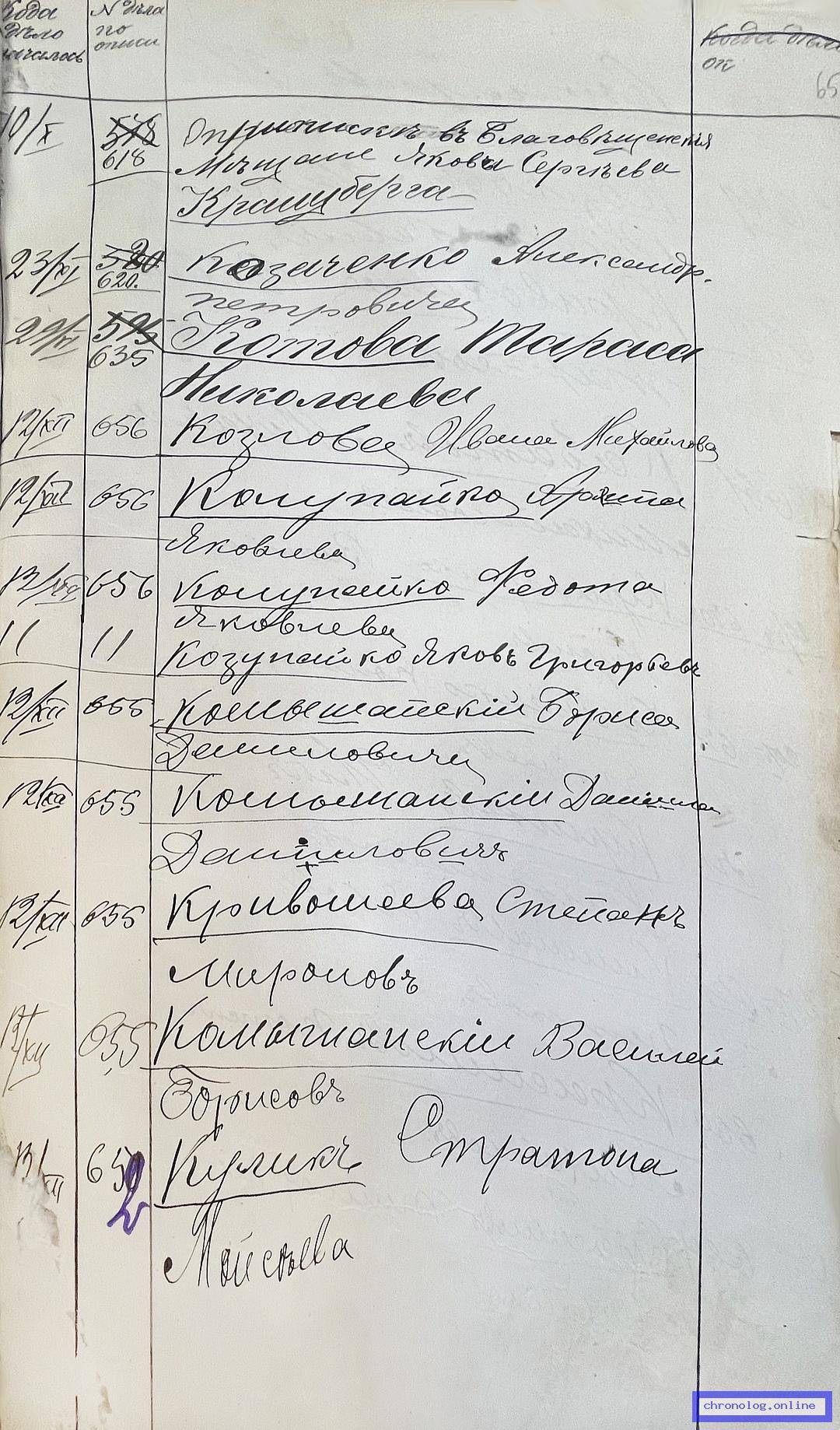 РГИАДВ 704-4-2691, Л.62об (Алфавитный список дел переселенческой части Канцелярии военного губернатора Амурской области за 1911 год): Крошко Емельян Тимофеевич показан в деле №500 от 3.9.1911 года (нумерация по старой описи, не действительная). Время и место исхода не показано. Снимки: 62об. | ||||