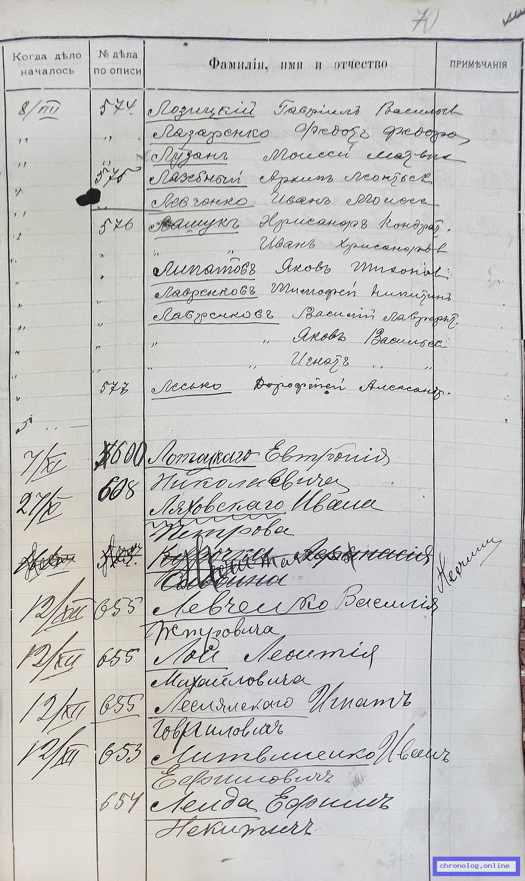 РГИАДВ 704-4-2691, Л.69об (Алфавитный список дел переселенческой части Канцелярии военного губернатора Амурской области за 1911 год): Литвиненко Антон Алексеевич показан в деле №574 от 8.8.1911 года (нумерация по старой описи, не действительная). Время и место исхода не показано. Снимки: 69об. | ||||