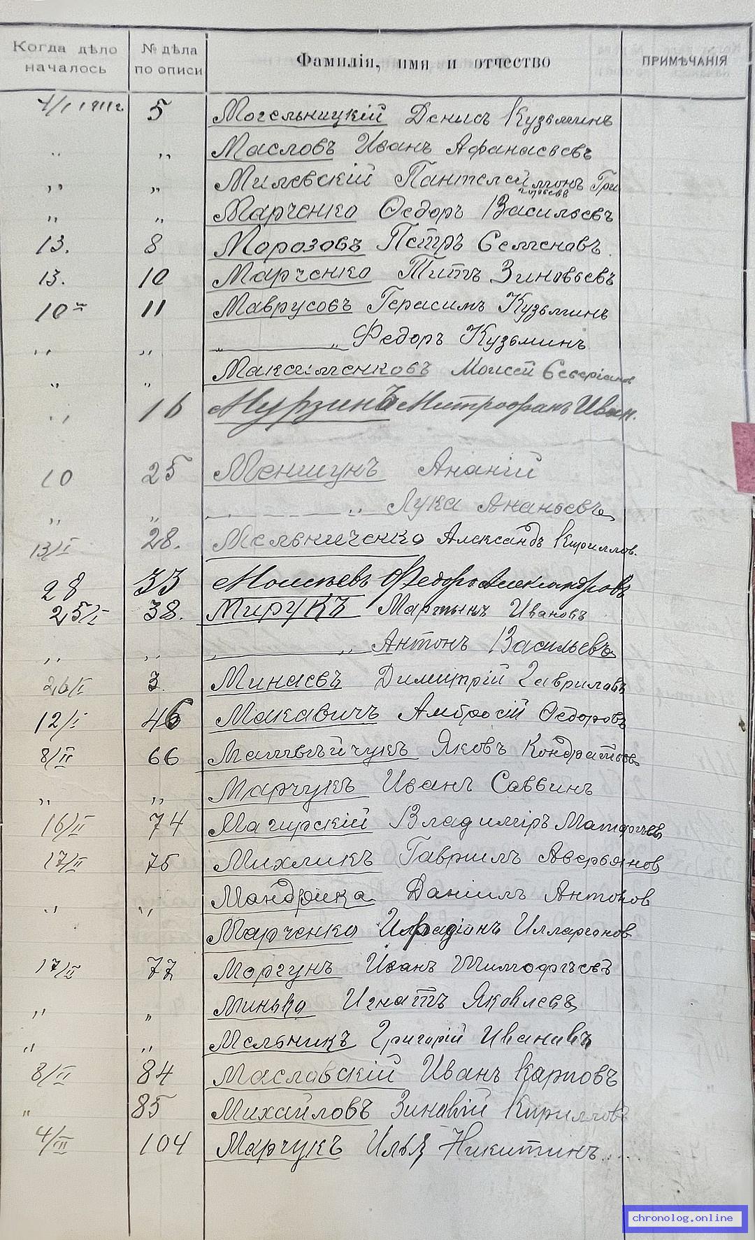 РГИАДВ 704-4-2691, Л.75 (Алфавитный список дел переселенческой части Канцелярии военного губернатора Амурской области за 1911 год): Морозов Пётр Семёнович показан в деле №8 от 13.1.1911 года (нумерация по старой описи, не действительная). Время и место исхода не показано. Снимки: 75. | ||||