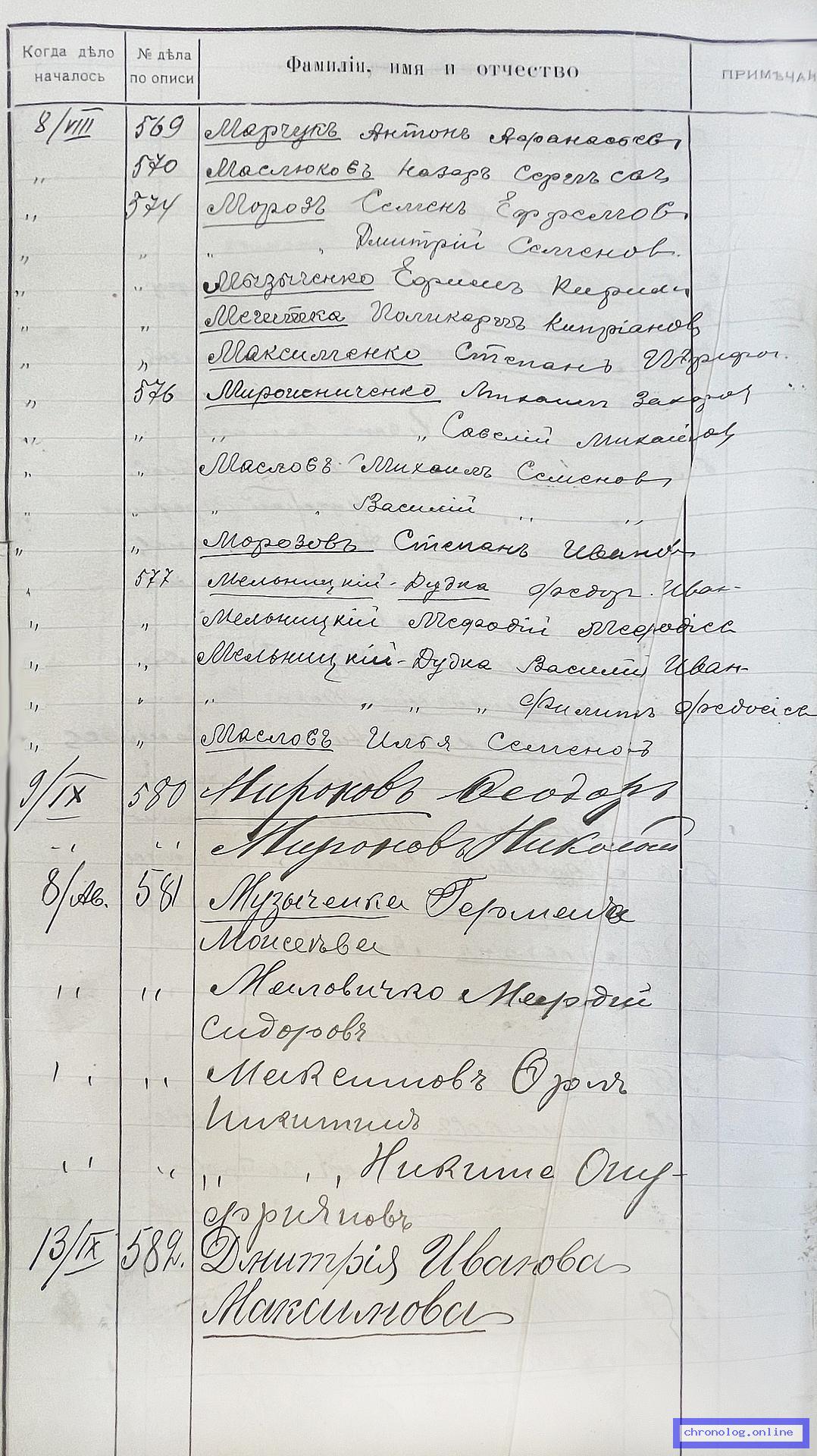 РГИАДВ 704-4-2691, Л.77об (Алфавитный список дел переселенческой части Канцелярии военного губернатора Амурской области за 1911 год): Мельницкий-Дудка Фёдор Иванович показан в деле №577 от 8.8.1911 года (нумерация по старой описи, не действительная). Время и место исхода не показано. Снимки: 77об. | ||||
