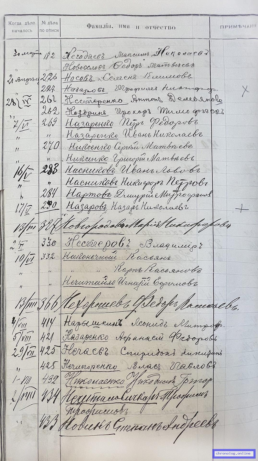 РГИАДВ 704-4-2691, Л.82об (Алфавитный список дел переселенческой части Канцелярии военного губернатора Амурской области за 1911 год): Новосёлов Фёдор Матвеевич показан в деле №182 от 30.3.1911 года (нумерация по старой описи, не действительная). Время и место исхода не показано. Снимки: 82об. | ||||