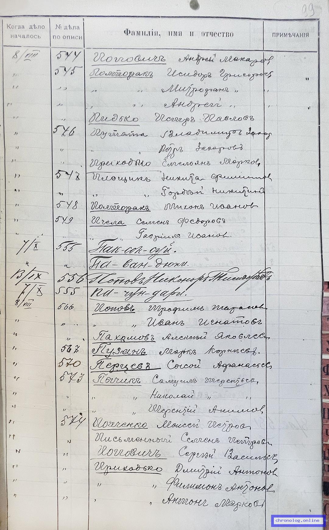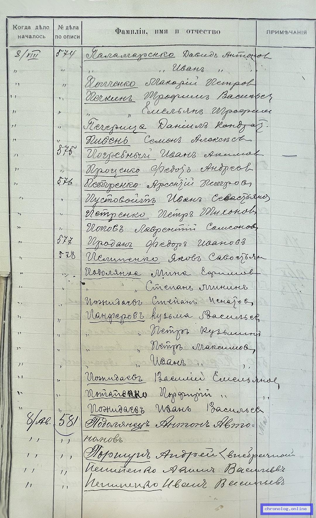 РГИАДВ 704-4-2691, Л.99 (Алфавитный список дел переселенческой части Канцелярии военного губернатора Амурской области за 1911 год): Пычик Николай Терентьевич показан в деле №573 от 8.8.1911 года (нумерация по старой описи, не действительная). Время и место исхода не показано. Снимки: 99. | ||||