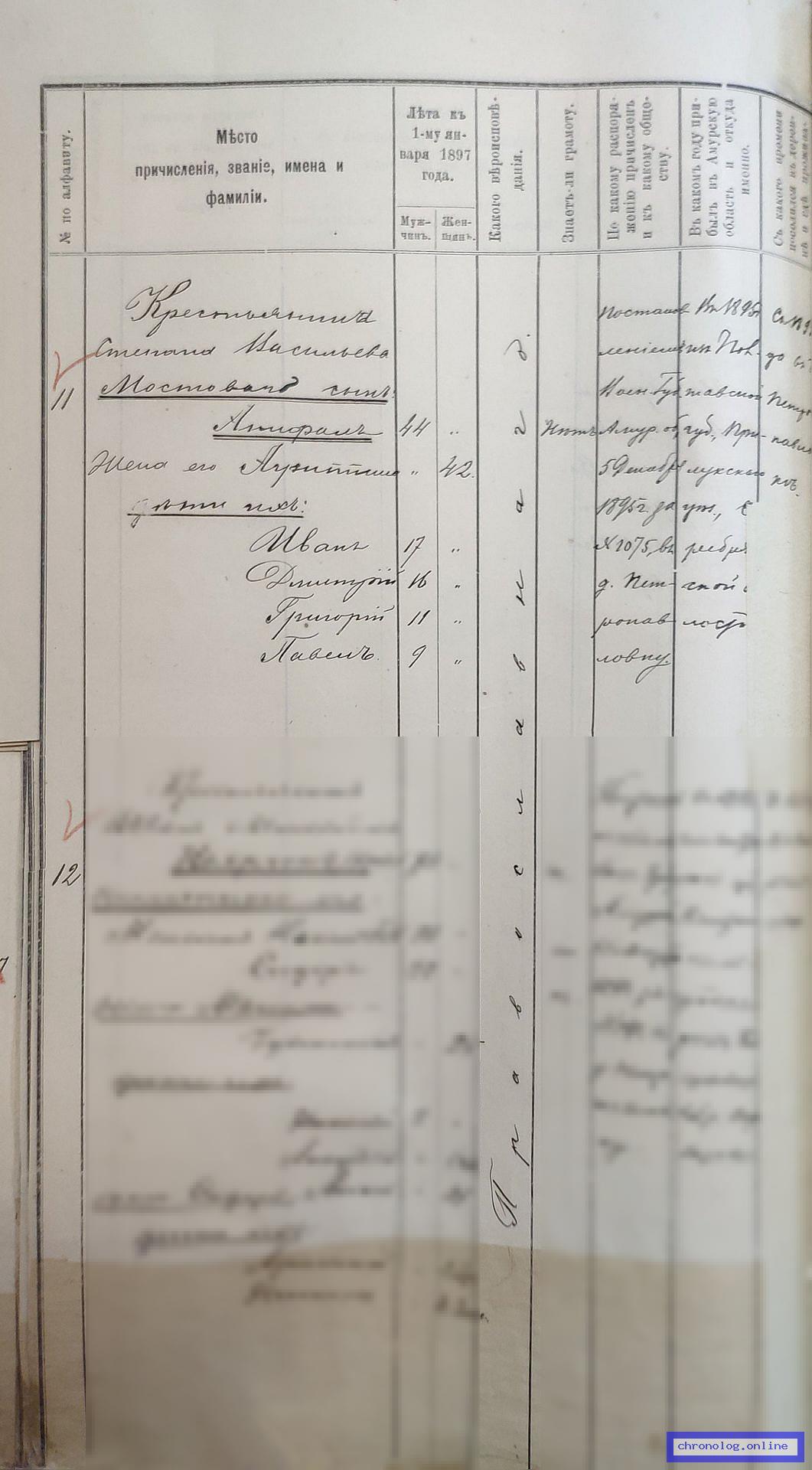 РГИАДВ 704-4-704, Л.35об., 36 (Списки крестьян деревни Петропавловки на 1897 год): Степан Васильевич Мостовой. Сын Анифал 44 лет. Жена Анифала Агрипина 42 лет, дети Иван 17 лет, Дмитрий 16 лет, Григорий 11 лет, Павел 9 лет. Исход: Серебрянская волость Прилукского уезда Полтавской губернии. Снимки: 35об, 36. | |||