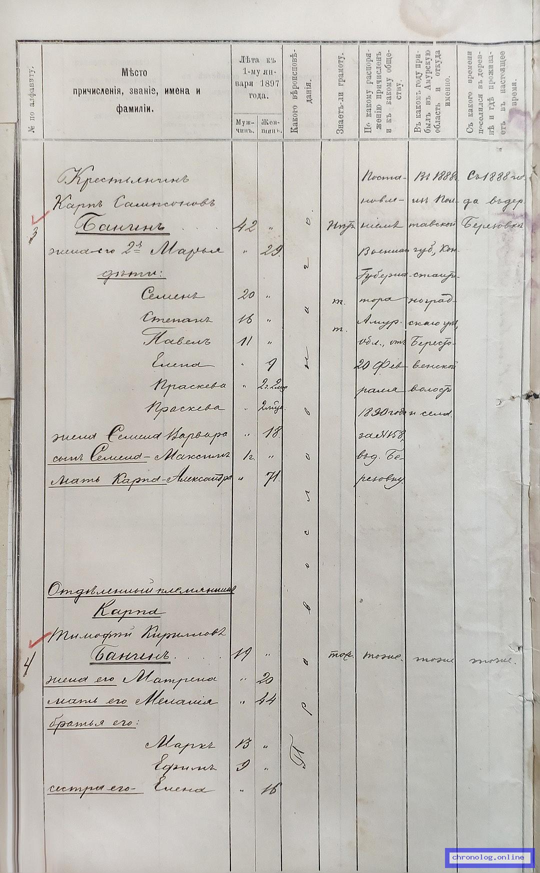 РГИАДВ 704-4-705, Л.4об., 5 (Списки крестьян деревни Берёзовки на 1897 год): Карп Самсонович Банин 42 лет, жена его вторая Марья 29 лет, дети: Семён 20 лет, Степан 16 лет, Пав 11 лет, Елена 9 лет, Праскева 2 года 2 месяца, Праскева 2 месяца. Жена Семёна Варвара 18 лет, сын Максим 1 год. Мать Карпа Александра 71 лет. Отделённый племянник Карпа Тимофей Кириллович Банин 19 лет, жена его Матрона 20 лет, мать его Мелания 44 лет, братья его: Марк 13 лет, Ефим 9 лет, сестра его Елена 16 лет. Исход: село Берестовенка Берестовенской волости Константиноградского уезда Полтавской губернии. Снимки: 4об, 5. | |||