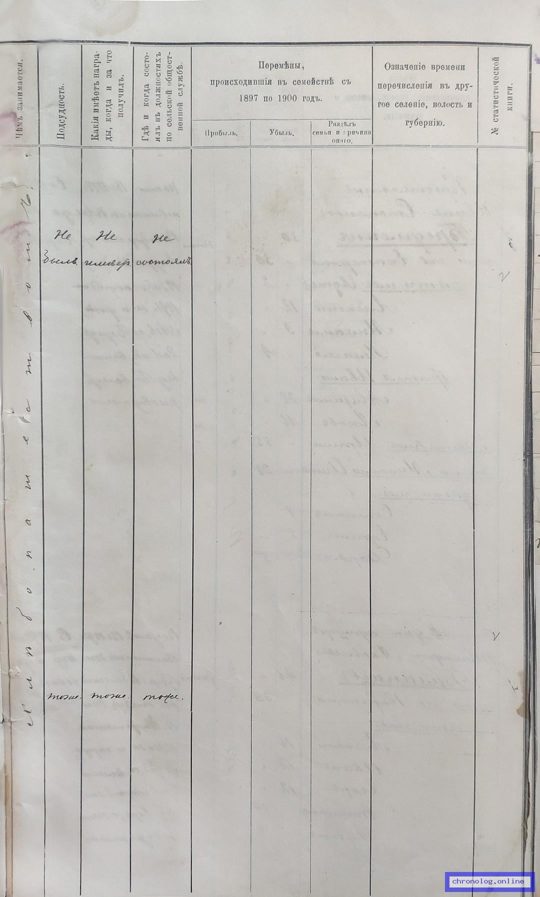 РГИАДВ 704-4-703, Л.51об., 52 (Списки крестьян деревни Ново-Алексеевки на 1897 год): Запасной рядовой Иван Прокопьевич Чуйко 31 лет. У него жена Анна 27 лет, сын Карп 1 год 2½ месяца. Братья Ивана Григорий 30 лет, Лука 26 лет, Козьма 16 лет. Сёстры Пелагея 20 лет, Татьяна 15 лет. Исход: село Барышевское Барышевской волости Переяславского уезда Полтавской губернии. Снимки: 51об, 52. | |||