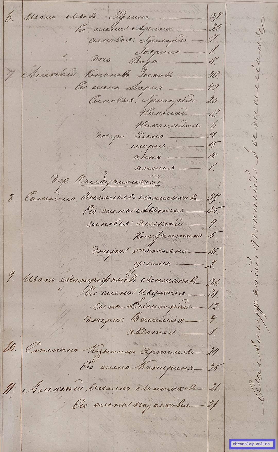 ГАЗК 30-2-270, Л.118, 134, 247 (Посемейные списки переселенцев на р. Амур): Урядник 12-го пешего батальона Семён Иванович Славутин 35 его жена Марья 34 сыновья Михайло 11 Егор 6 дочери Катерина 14 Аграфена 12 Федосья 9 Авдотья 4 Марья 2. Исход: деревня Старолоншакова Нерчинского уезда. Снимки: 118, 134, 247. | |||