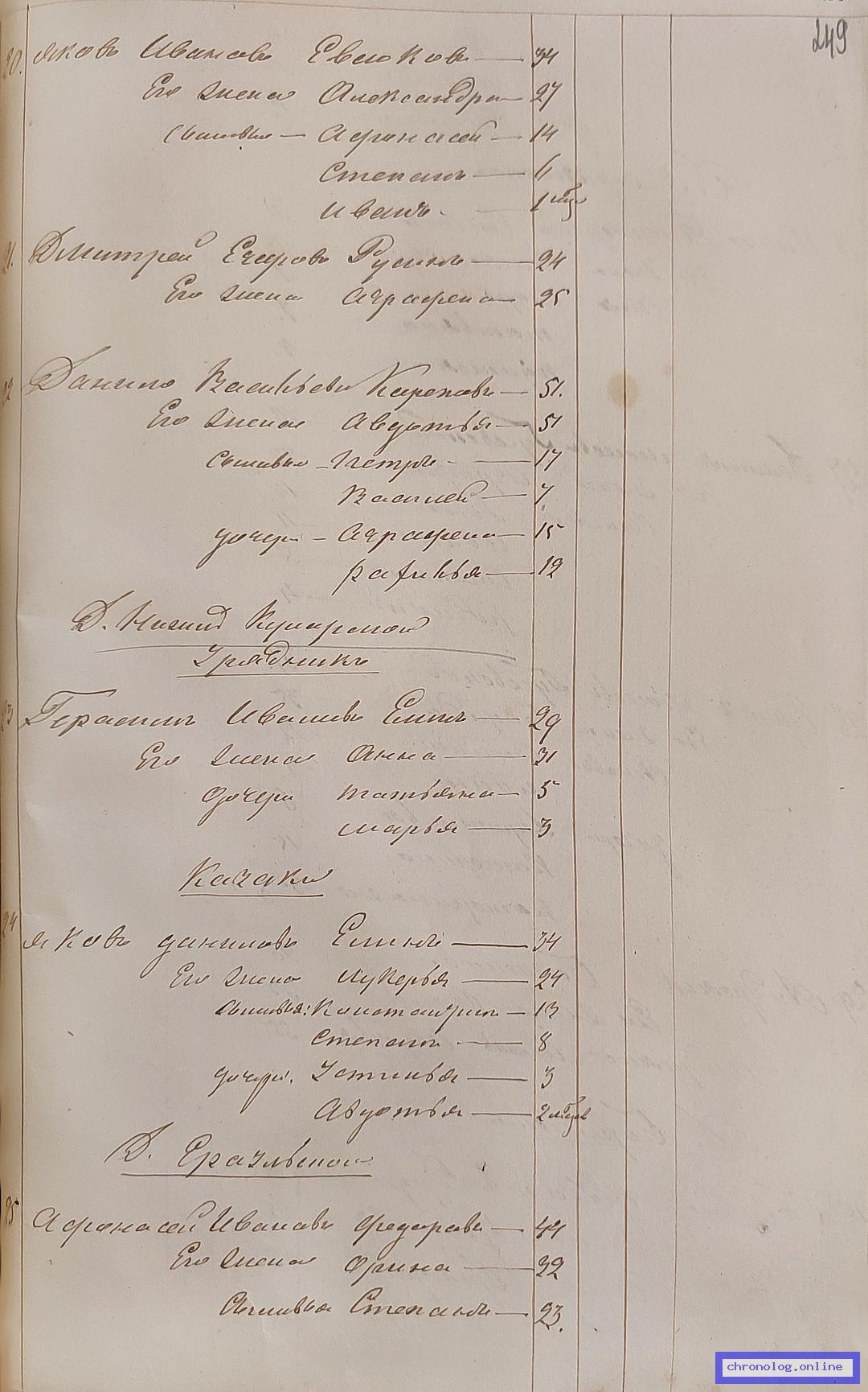 ГАЗК 30-2-270, Л.94, 131об, 215 (Посемейные списки переселенцев на р. Амур): Казак 9-го пешего батальона Епифан Васильевич Ушаков 39 его жена Анисья 34 сын Илья 1 дочери Степанида 12 Катерина 7 Федосья 5 Анисья 3. Исход: деревня Бронникова Нерчинского уезда. Снимки: 94, 131об, 215. | |||