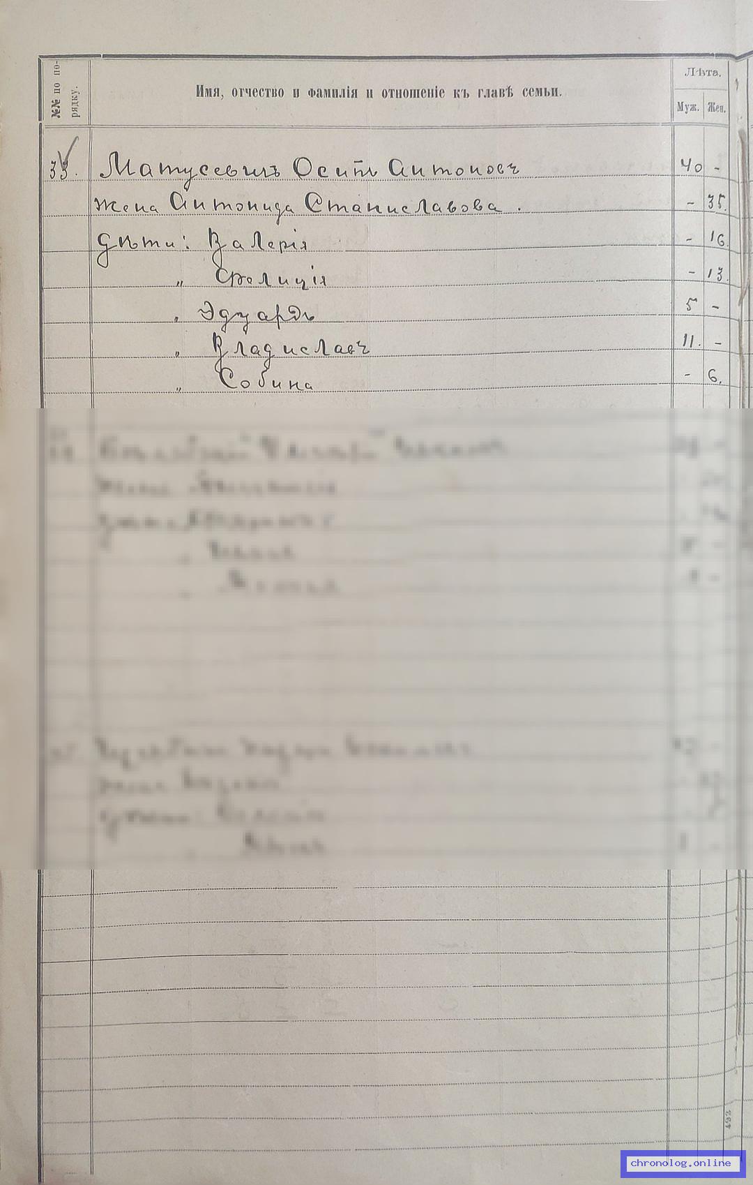РГИАДВ 704-4-2639, Л.11об., 12 (О причислении переселенцев к сельскому обществу посёлка Усть-Пермского Гондатиевской волости в 1910 году): Матусевич Осип Антонович 40 лет, жена Антонида Станиславовна 35 лет. Дети: Валерия 16 лет, Фолиция 13 лет, Владислав 11 лет, Собина 6 лет, Эдуард 5 лет. Исход: деревня Козловщина Гольшанской волости Ошмянского уезда Виленской губернии. Снимки: 11об, 12. | |||