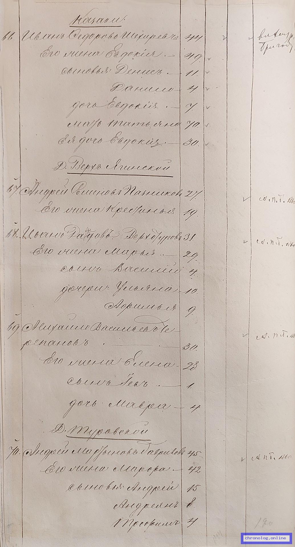 ГАЗК 30-2-270, Л.57об, 58, 137 (Посемейные списки переселенцев на р. Амур): Казак 6-го пешего батальона Андрей Мартынович Гаврилов 45 его жена Марфа 42 сыновья Андрей 15 Андреян 8 Трофим 4 Агапий 1 дочь Евдокия 14. Исход: деревня Туровская Нерчинского уезда. Снимки: 57об, 58, 137. | |||
