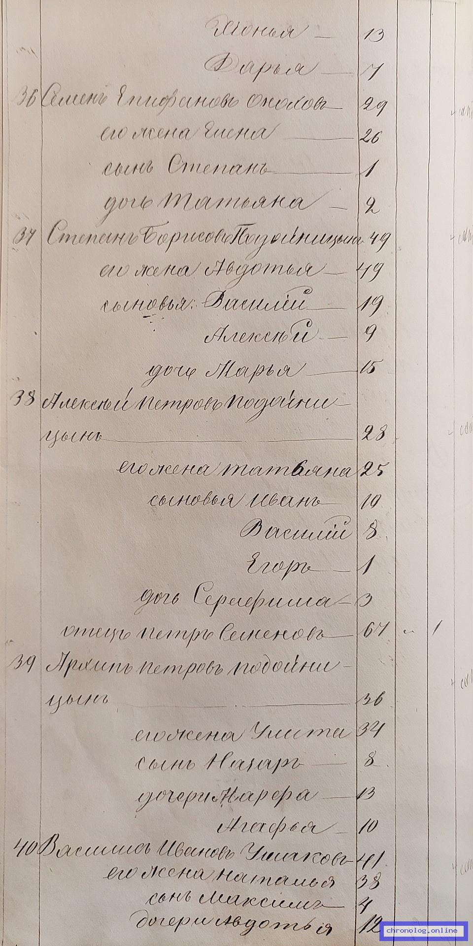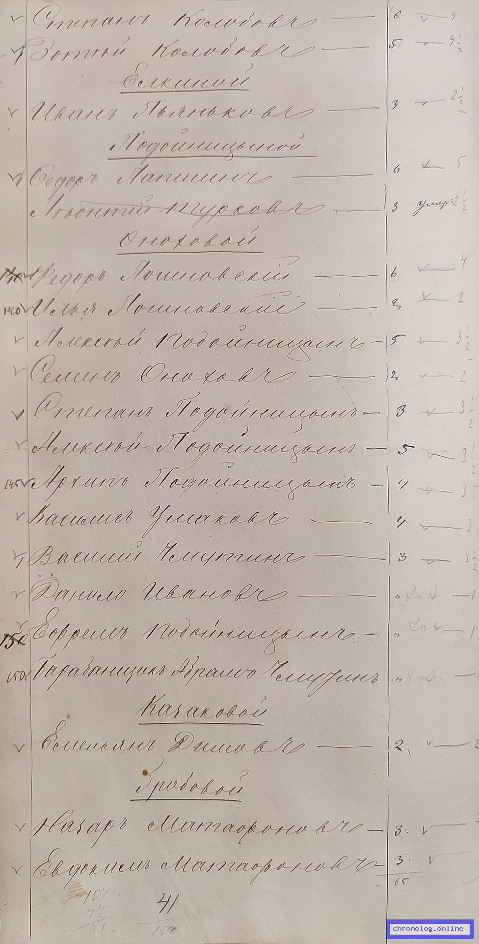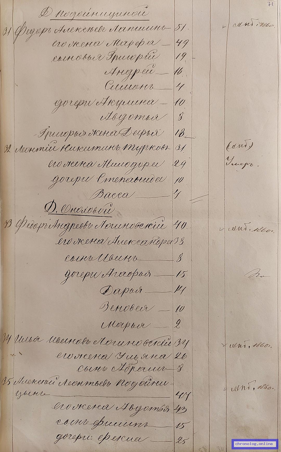 ГАЗК 30-2-270, Л.71, 71об, 138об (Посемейные списки переселенцев на р. Амур): Казак 7-го пешего батальона Алексей Леонтьевич Подойницын 47 его жена Авдотья 43 сын Филипп 15 дочери Фёкла 25 Хионья 13 Дарья 7. Исход: деревня Онохова Нерчинского уезда. Снимки: 71, 71об, 138об. | |||