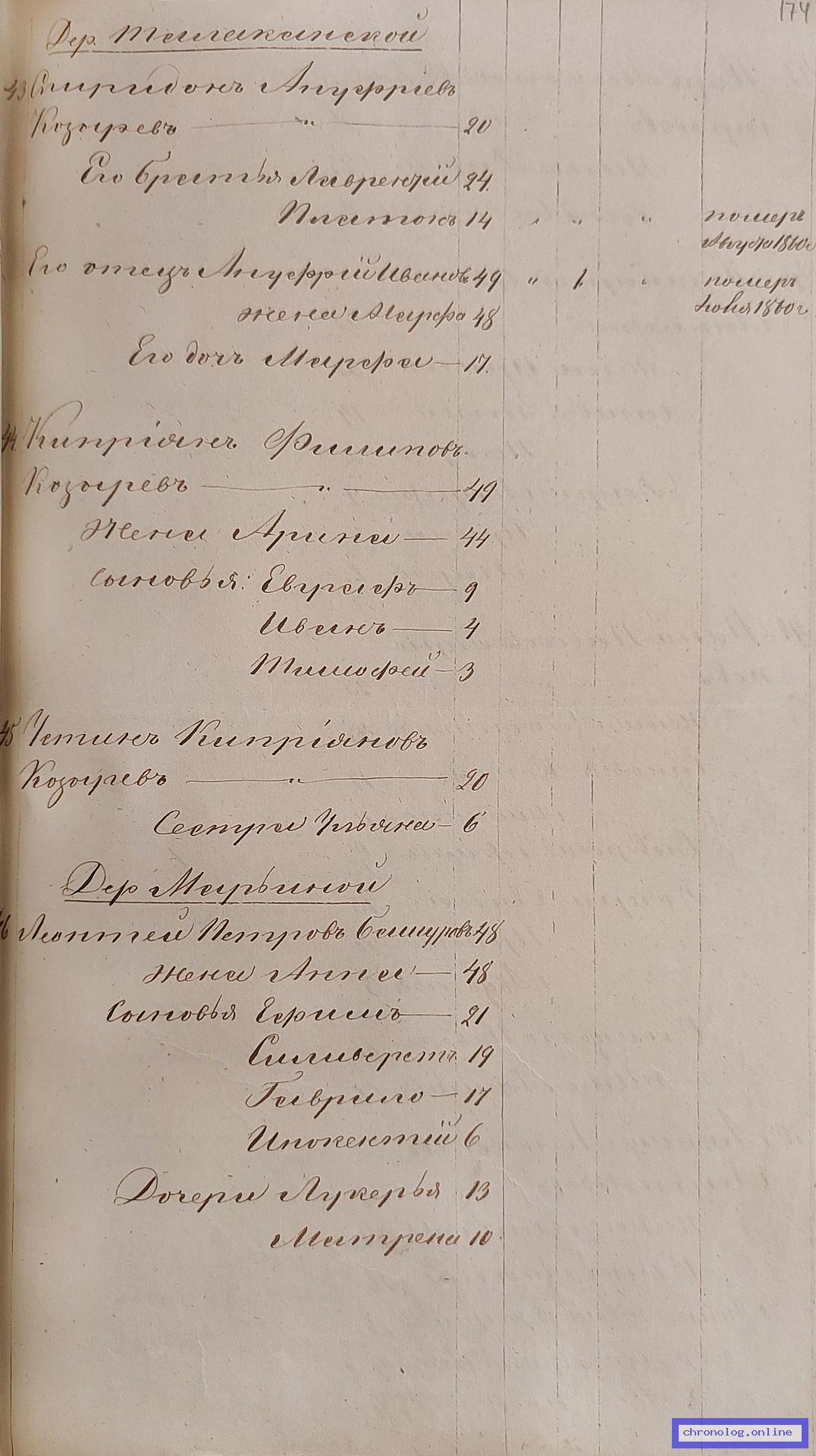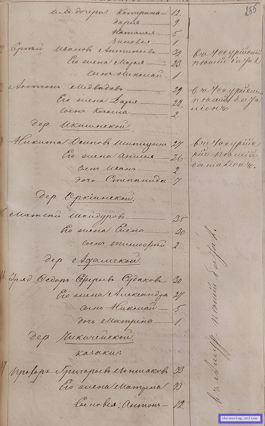 ГАЗК 30-2-270, Л.85об, 131, 216 (Посемейные списки переселенцев на р. Амур): Казак 9-го пешего батальона Иван Панфилович Черепанов 30 его жена Елена 26 сын Яков 4 дочь Лукерья 1. Исход: деревня Утанская Нерчинского уезда. Снимки: 85об, 131, 216. | |||