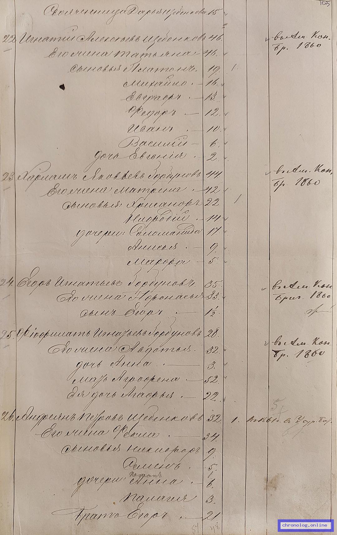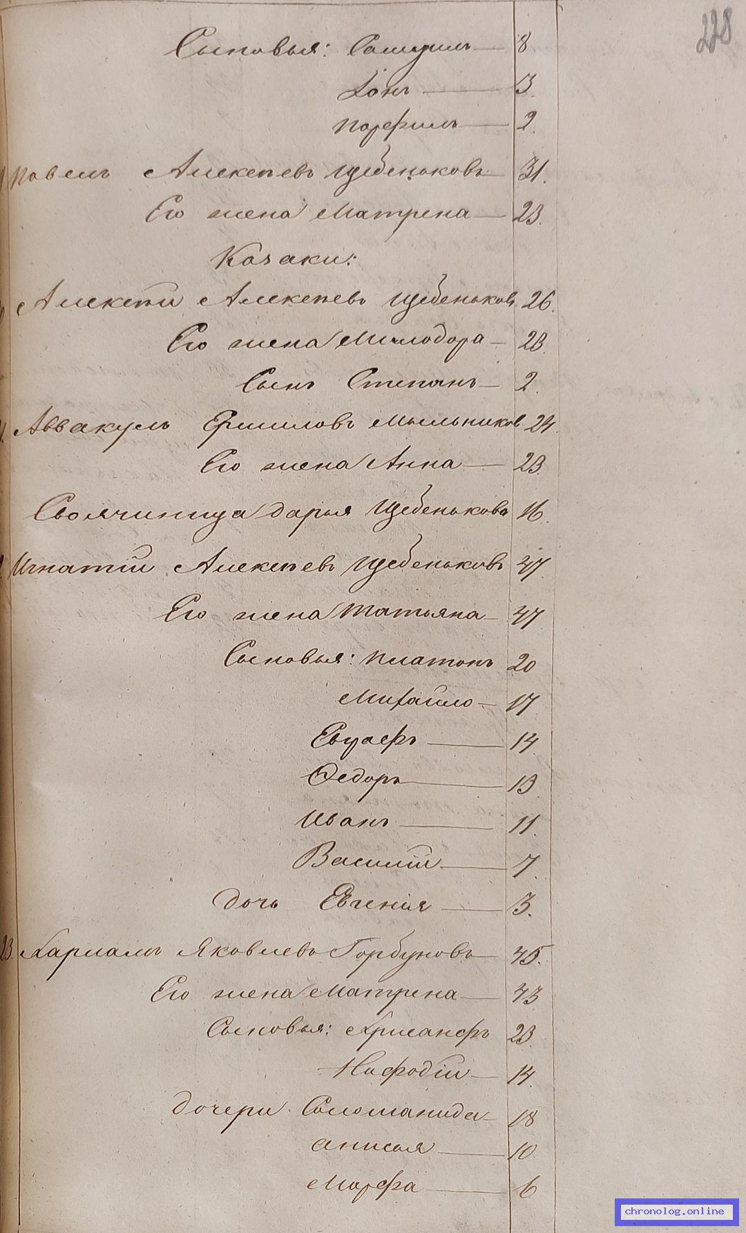 ГАЗК 30-2-270, Л.103, 132, 228 (Посемейные списки переселенцев на р. Амур): Казак 10-го пешего батальона Харлам Яковлевич Горбунов 45 его жена Матрена 43 сыновья Хрисанф 23 Нифодий 14 дочери Соломонида 18 Анисья 10 Марфа 6. Исход: деревня Кусочинская Нерчинского уезда. Снимки: 103, 132, 228. | |||
