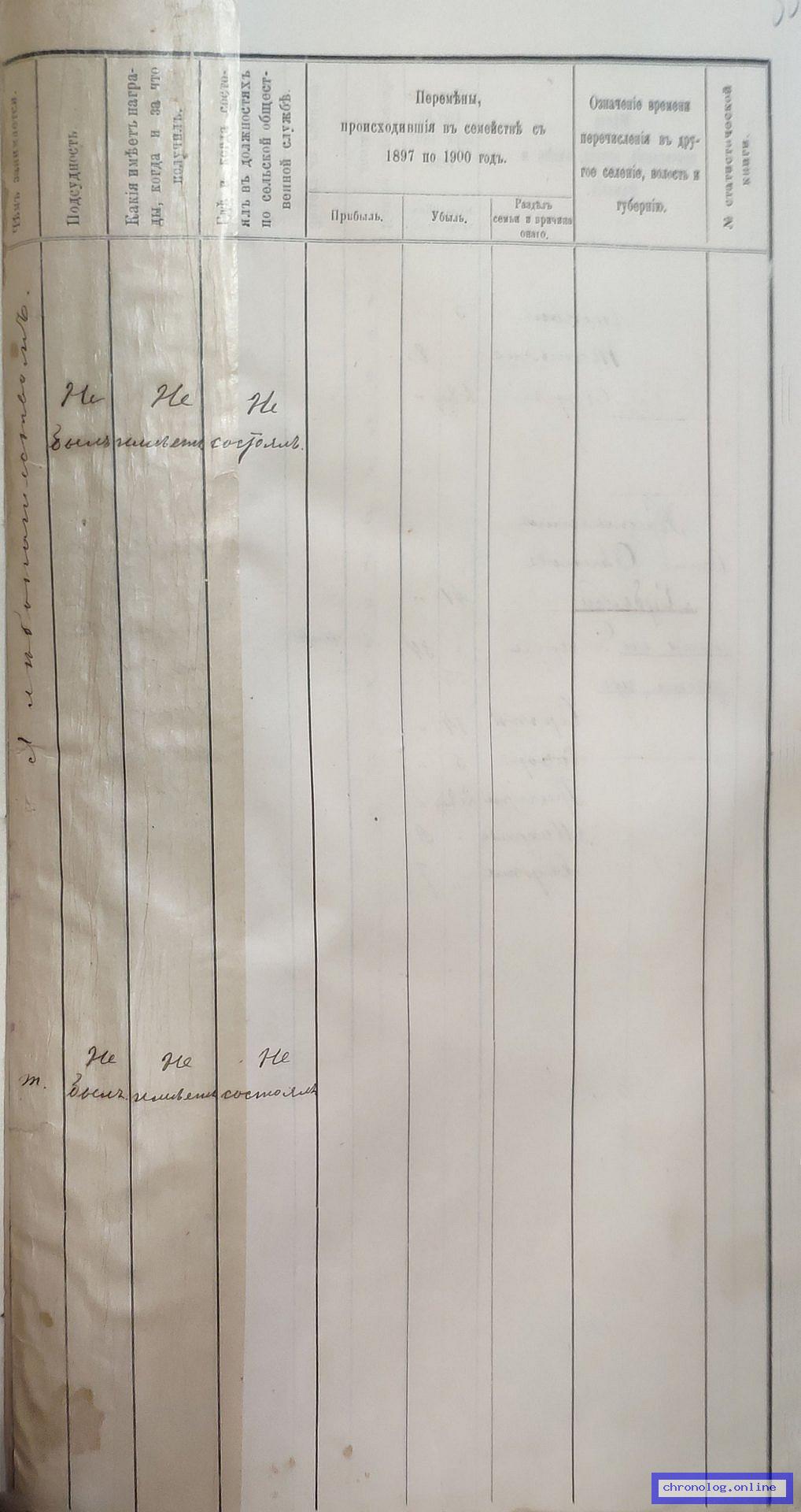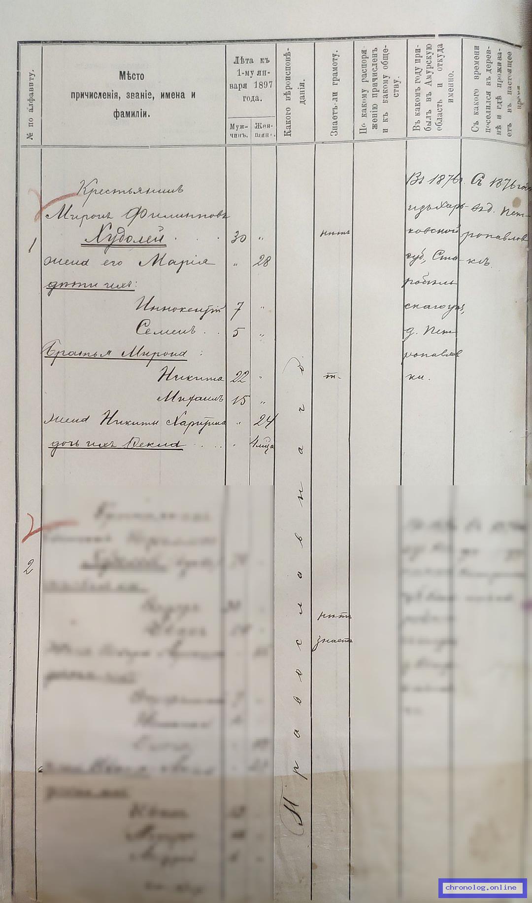 РГИАДВ 704-4-704, Л.54об., 55 (Списки крестьян деревни Петропавловки на 1897 год): Мирон Филиппович Худолей 30 лет. У него жена Мария 28 лет, дети: Иннокентий 7 лет, Семён 5 лет. Братья Мирона Никита 22 лет, Михаил 15 лет. Жена Никиты Харитина 24 лет, дочь Фёкла 4 месяца. Исход: деревня Петропавловка Старобельского уезда Харьковской губернии. Снимки: 54об, 55. | |||