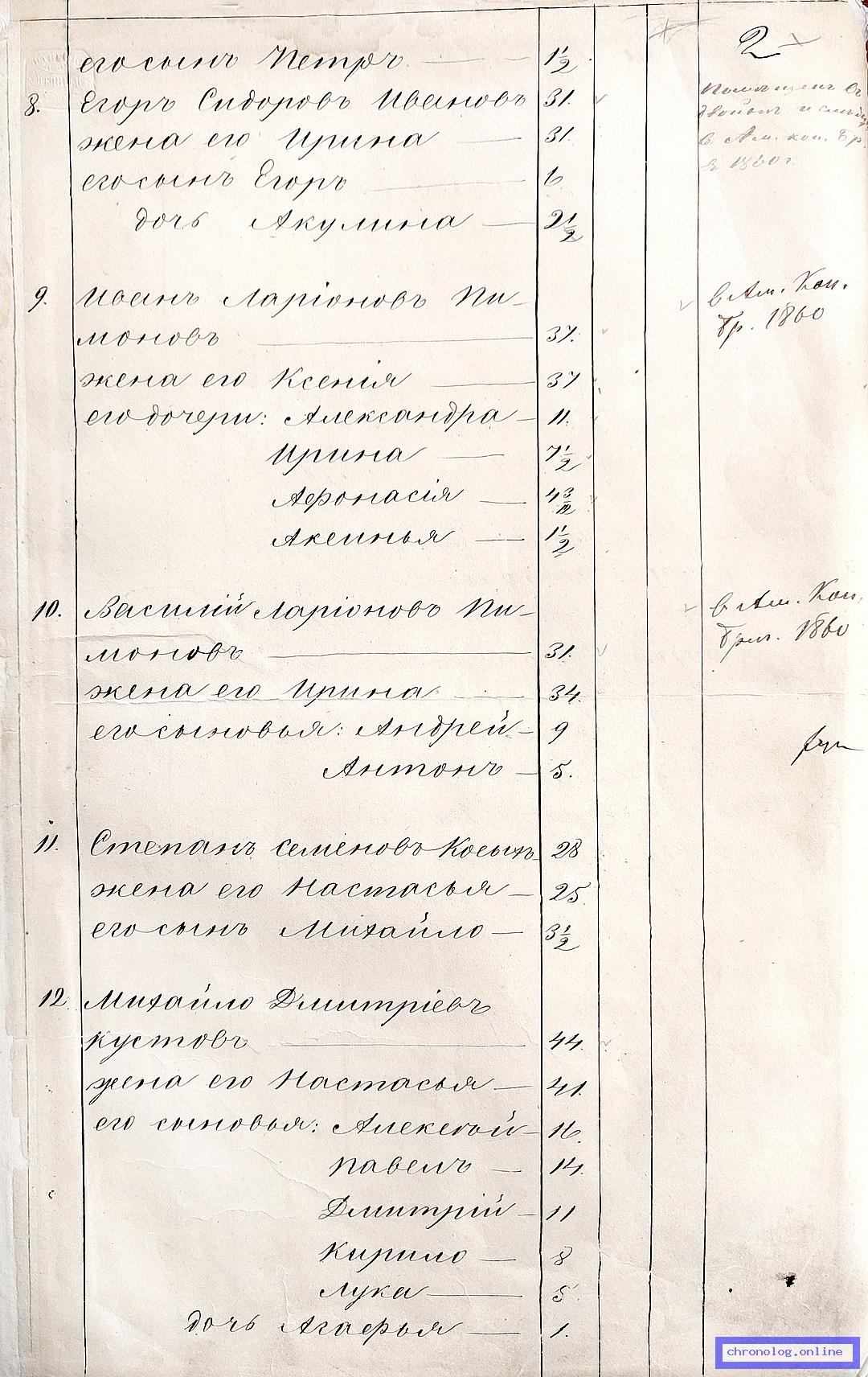 ГАЗК 30-2-270, Л.2, 134, 146 (Посемейные списки переселенцев на р. Амур): Казак 1-го пешего батальона Василий Ларионович Пименов 31 жена его Ирина 34 сыновья Андрей 9 Антон 5. Исход: село Быркинское Нерчинского уезда. Снимки: 2, 134, 146. | |||