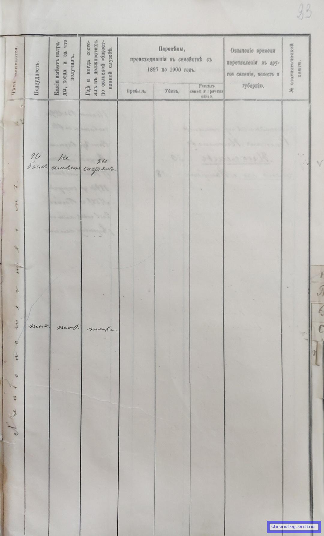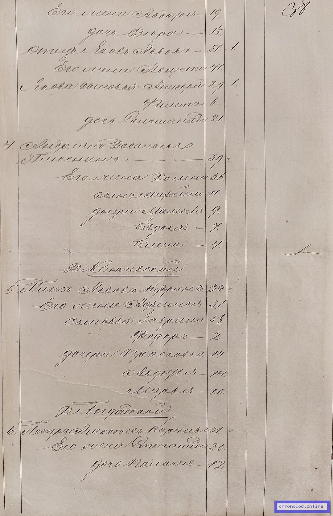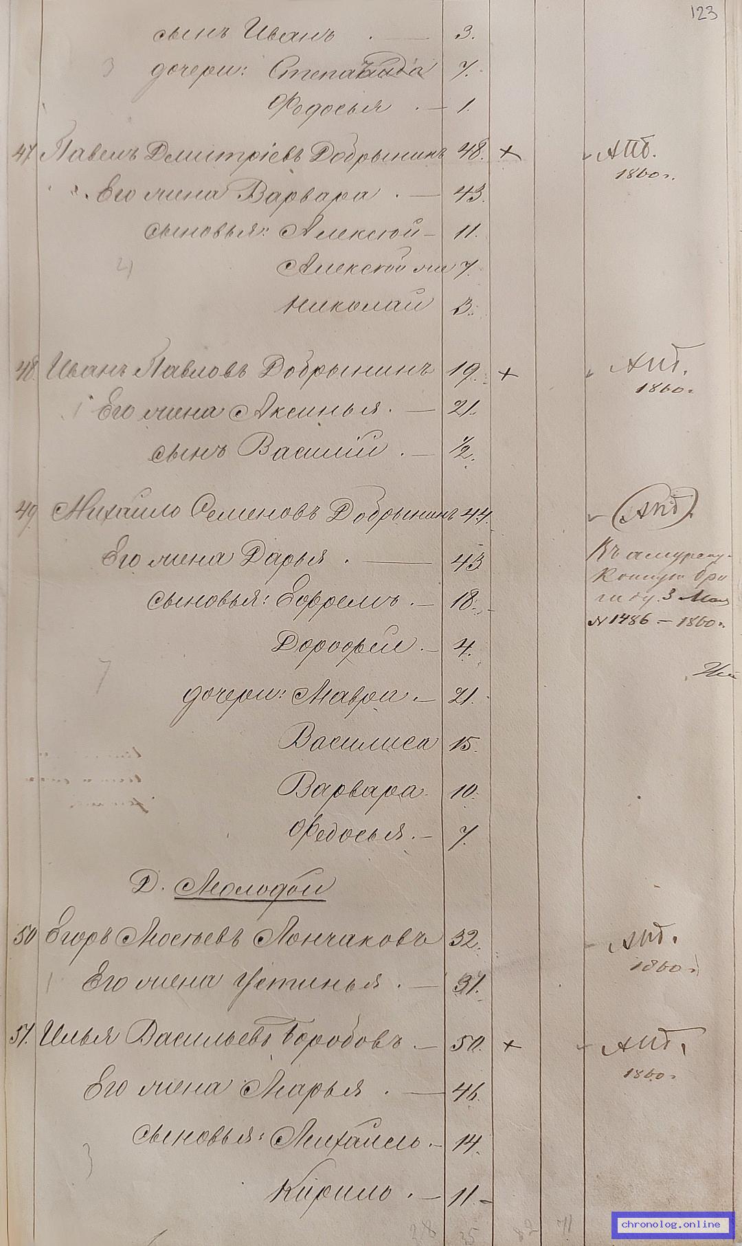 ГАЗК 30-2-270, Л.123, 142об, 251 (Посемейные списки переселенцев на р. Амур): Казак 12-го пешего батальона Иван Павлович Добрынин 20 его жена Аксинья 22 сын Василий 1. Исход: деревня Шокшинская Нерчинского уезда. Снимки: 123, 142об, 251. | |||