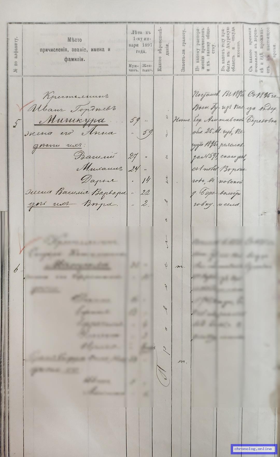 РГИАДВ 704-4-705, Л.22об., 23 (Списки крестьян деревни Берёзовки на 1897 год): Иван Гордеевич Мишкура 59 лет. Жена его Анна 59 лет, дети их: Василий 27 лет, Михаил 24 лет, Дарья 14 лет. Жена Василия Варвара 22 лет, дочь их Вера 2 лет. Исход: село Вороньков Вороньковской волости Переяславского уезда Полтавской губернии. Снимки: 22об, 23. | |||