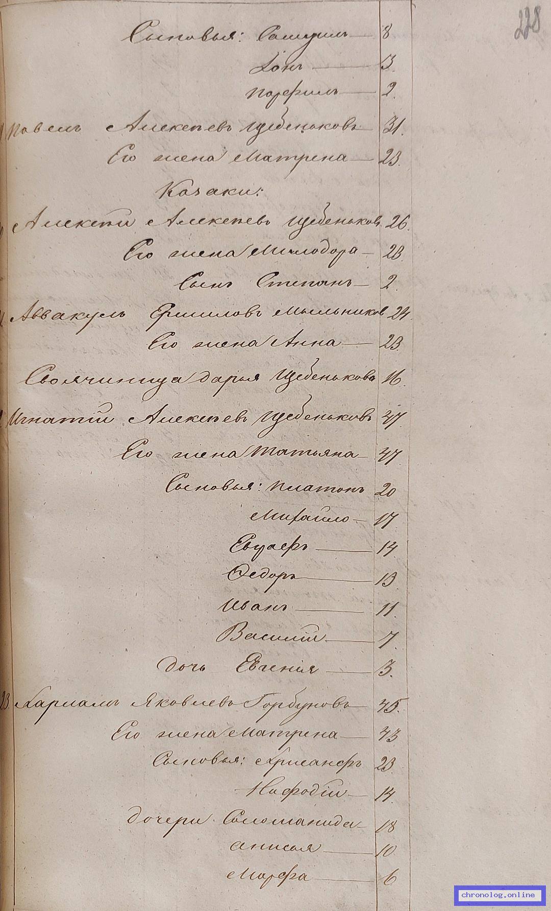 ГАЗК 30-2-270, Л.103, 132, 228 (Посемейные списки переселенцев на р. Амур): Казак 10-го пешего батальона Игнатий Алексеевич Щебеньков 47 его жена Татьяна 47 сыновья Платон 20 Михайло 17 Евграф 14 Фёдор 13 Иван 11 Василий 7 дочь Евгения 3. Исход: деревня Кусочинская Нерчинского уезда. Снимки: 103, 132, 228. | |||