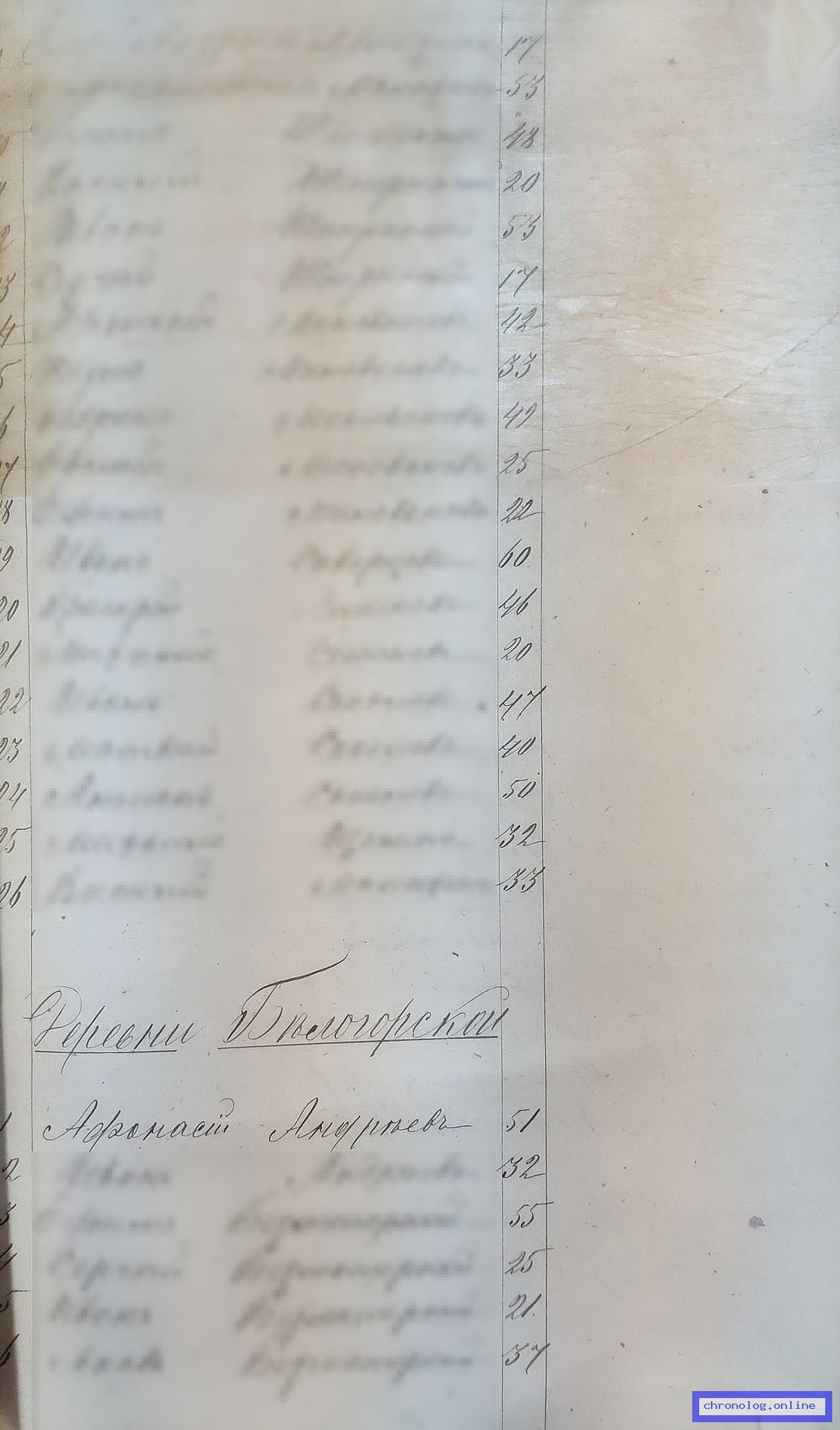 РГИАДВ 704-4-344, Л.16 (Список крестьян Амурской области, подлежащих отбытию повинностей в 1882 году): Крестьянин деревни Белогорской Андреев Афанасий 51 лет. Время и место исхода не показано. Снимки: 16. | |||