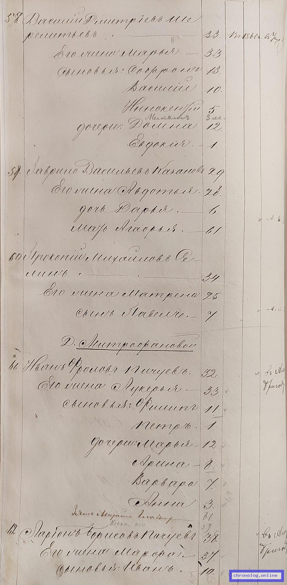 ГАЗК 30-2-270, Л.119об, 142, 248 (Посемейные списки переселенцев на р. Амур): Казак 12-го пешего батальона Давид Ослопов 56 его жена Матрена 50 сыновья Митрофан 31 Василий 28 Иван 21 Иннокентий 18 дочери Авдотья 19 Лукерья 12. Исход: село Ломовское Нерчинского уезда. Снимки: 119об, 142, 248. | |||